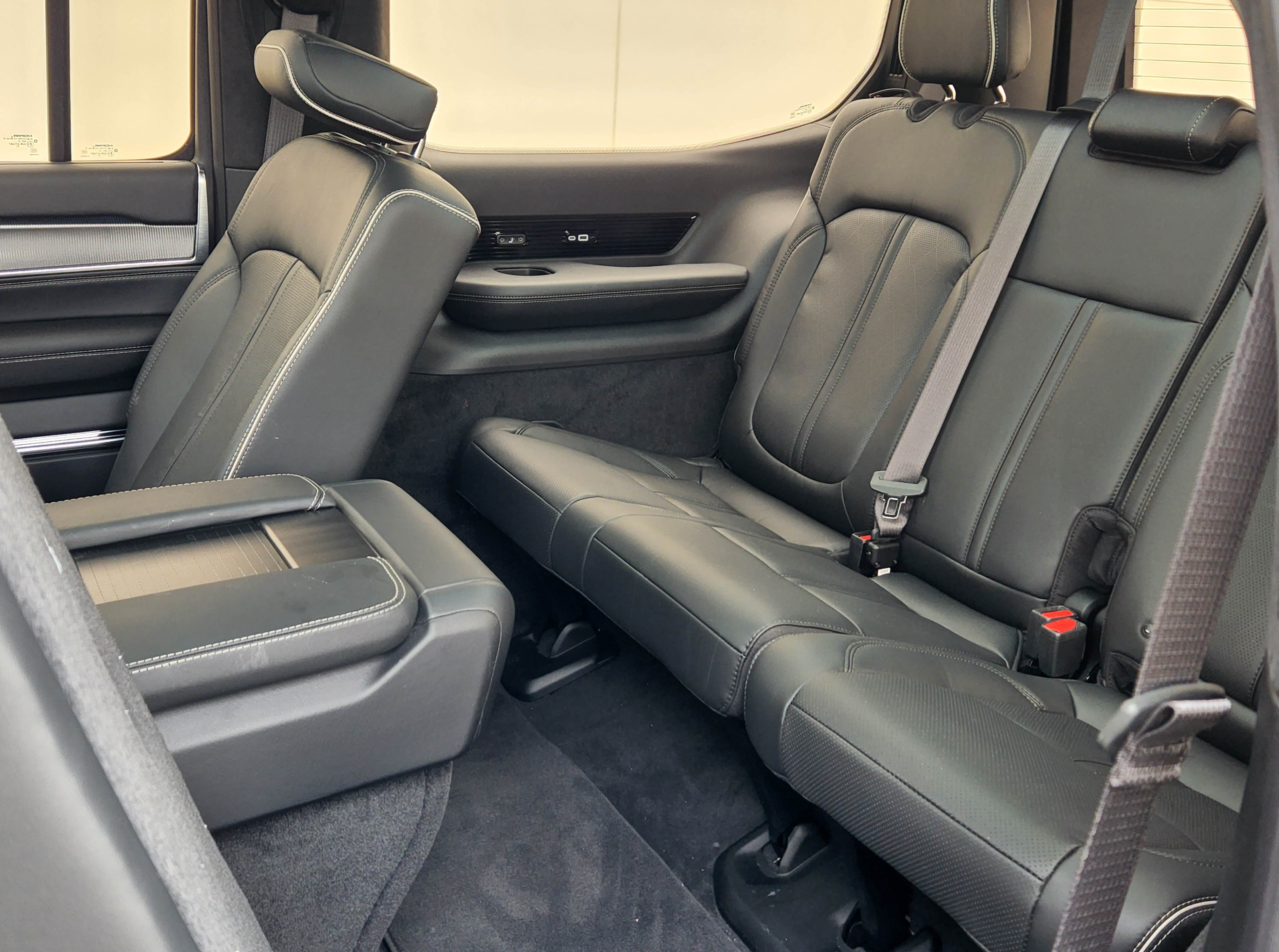 This one would seat 7 with captain’s chairs in row 2, plus a giant console with screen. If you order a bench seat for row 2, the vehicle could seat 8. A power hatch in back allows you to step under it and press power buttons to lower the third and second row seats.
