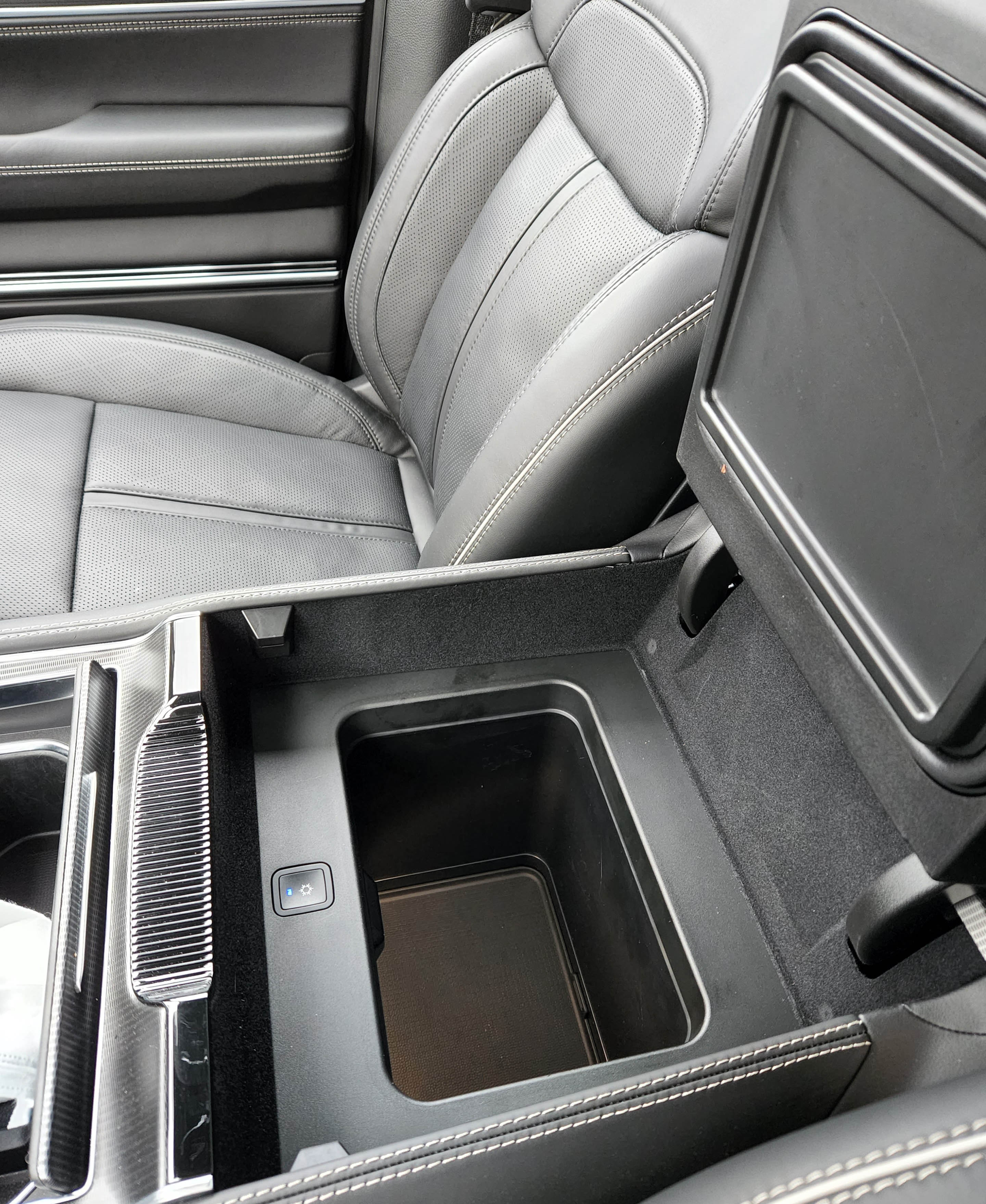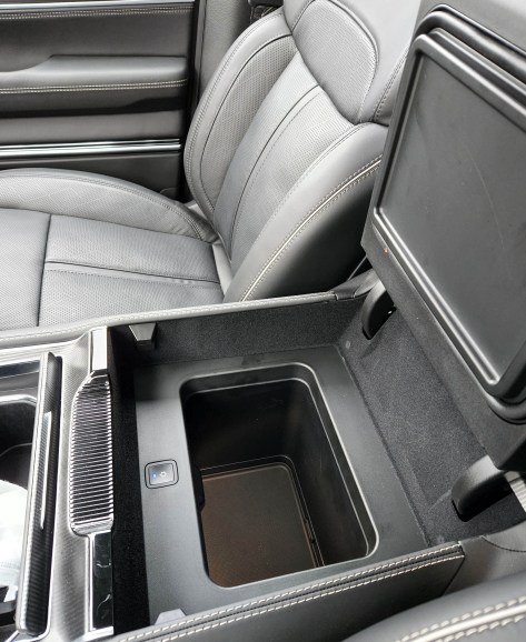 For penny pinchers the Obsidian package adds $5,000 to the overall price and includes all that black trim, inside and out, the fancy stereo, cooled second row seats, snazzy black accented 22-inch wheels, and a cooler between the seats inside the console. It was absolutely frigid, so nice for soft drinks, or sushi!