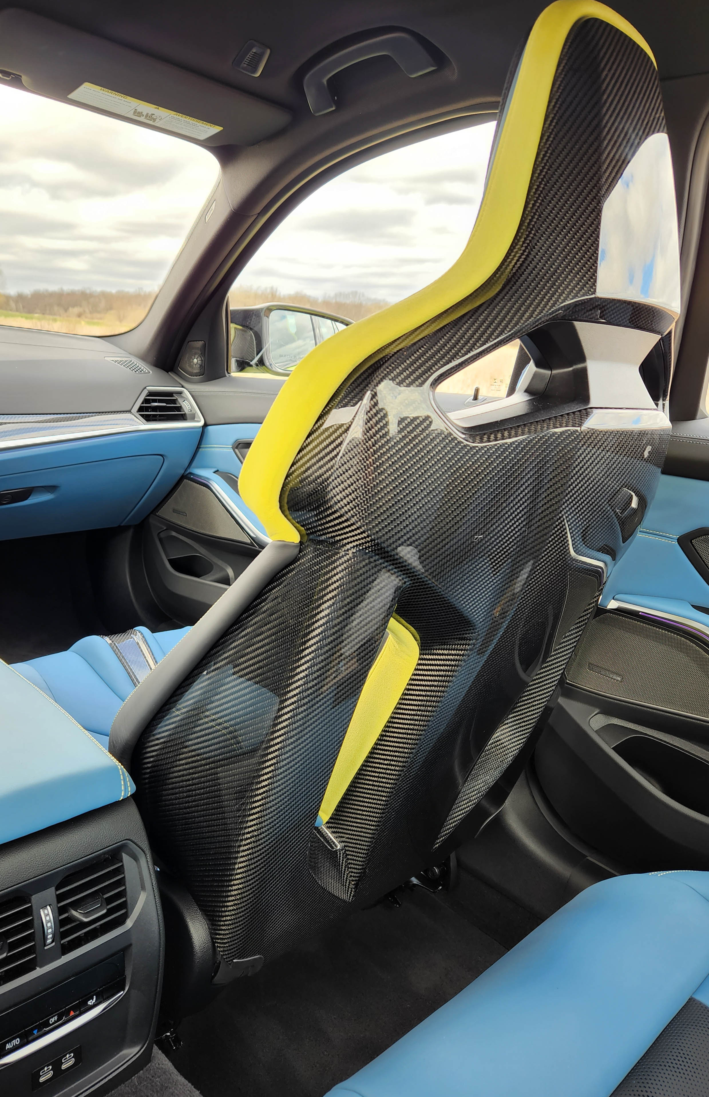 Thatās right, the test car added carbon fiber race seats for $3,800. They fit the driver and front passenger like they are track bound with power adjustable side bolsters. These things are extremely comfy, once you drop into them, and thatās how you enter. Then they are as snug as Aunt Agnus hugging you after Thanksgiving dinner.