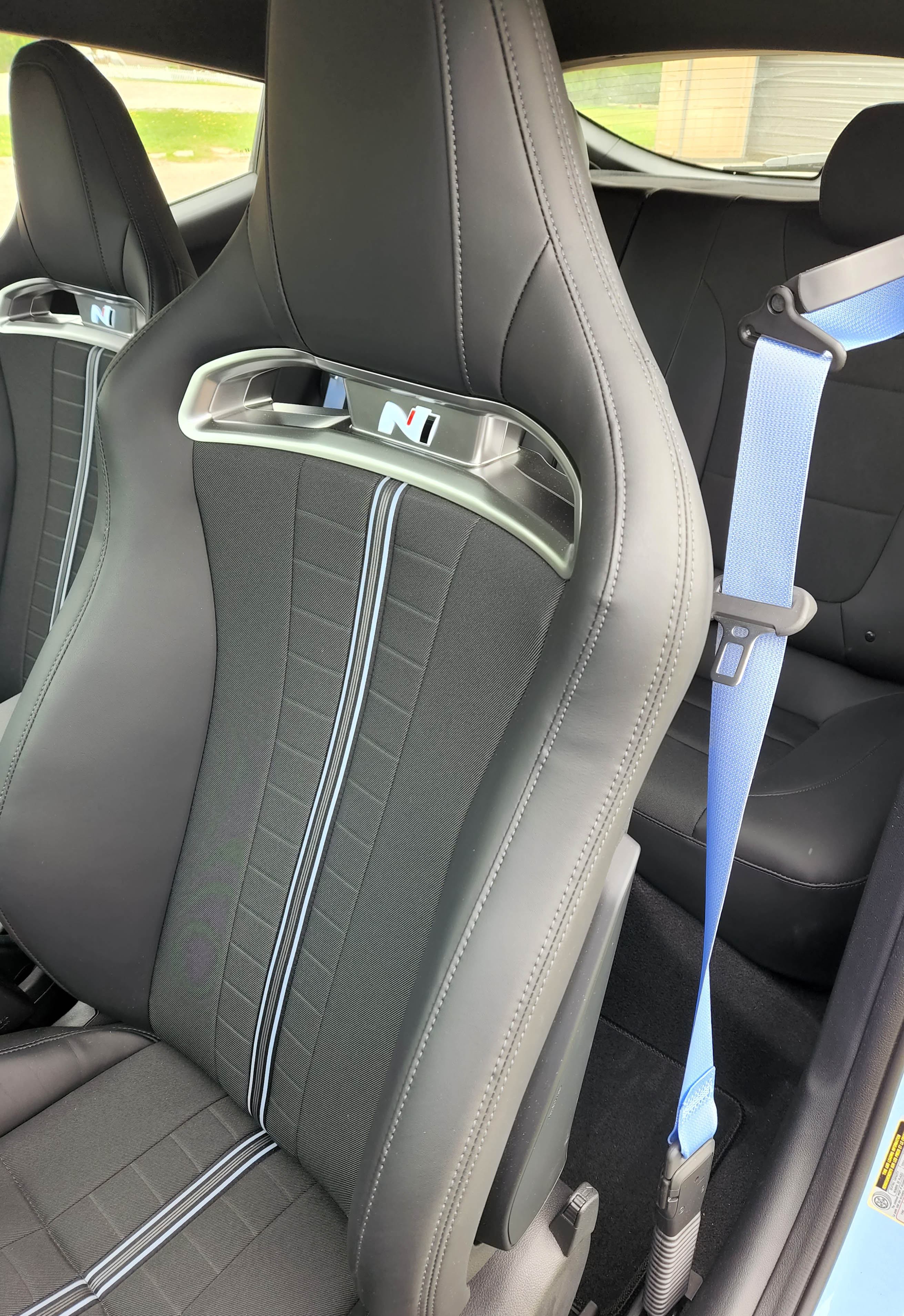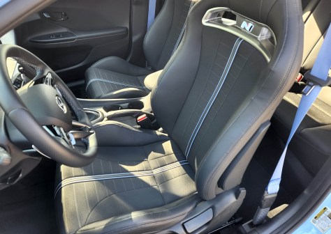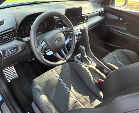 Inside the Veloster N looks as special as its exterior with N logos on door sills, shifter and seat backs. Seats are black cloth and faux leather with a blue racing stripe up the middle of each front seat and chrome trim bejeweled with the N logo, just below the headrest. A textured dark gray trim keeps the doors and dash serious looking and prevents interior reflections.
