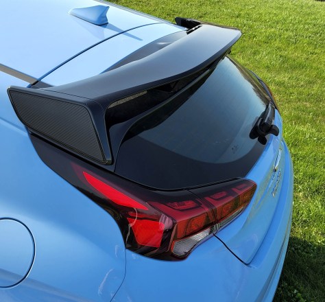Fifth, for looks and potentially for performance (top speed is 155 mph), Hyundai equips the Veloster N with a 2-stage rear spoiler that looks serious, and is.