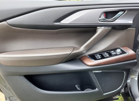 The gray SUV went with a black over brown interior design, the seats being perforated brown Nappa leather with quilted leather outer edges and bolsters, plus white piping, all to insinuate luxury. Mazda uses real wood, Santos Rosewood, for trim on the dash and doors, but also adds a thin chrome ring atop the console, which is gloss black and therefore reflects on sunny days.