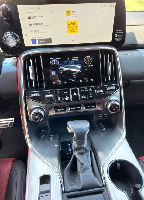 Lexus also upgrades the LX to a 12.3-inch infotainment touchscreen, a much needed improvement compared with the old console-mounted touchpad and knob. The screen worked fine and the test SUV included a snazzy Mark Levinson sound system, costing $2,660 extra. A smaller screen below the info touchscreen handles climate control functions.