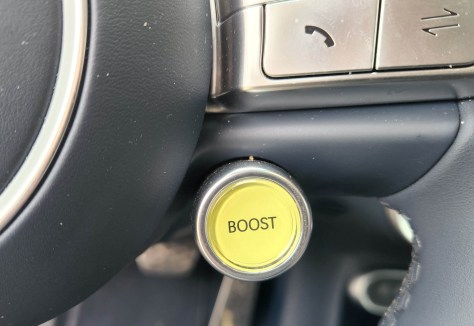 Its twin 215-horsepower electric motors, one for the front wheels, one for the back, deliver 429 hp. (Not sure why it’s not 430!) But that is Not enough my friend. No, there’s a Boost button on the steering wheel to compete with Tesla’s Insane setting. The booster rocket button delivers another 54 hp for a total of 483 and a torque rating of 516.
