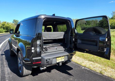 Note too that if the rear seat is occupied there is precious little cargo room behind the seat, maybe one upright suitcase or several grocery bags. The rear seats do fold down to boost storage. But in practical terms the Defender is a two-person vehicle, while five could tolerate short hops around town.