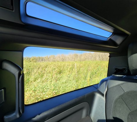 Likewise it’s awkward to climb in the Rover and especially so for rear seat riders. First problem, this is a two-door. Second problem it’s a huge step up (11.5 inches of ground clearance) to get inside, but there are plenty of grab handles on the dash and ceiling. Third, for the rear seat, which is fairly roomy, a person must press a button once to power the front seat forward, then flip a stiff lever atop the seat to flip the seatback forward. Once settled in back it’s easiest for your passenger-side front seat occupant to press, and hold, a power seat button to return the seat ever so slowly to its original setting. Again, really? I’ve been in $20k econo-coupes with one-lever manual seat access to the rear seat.