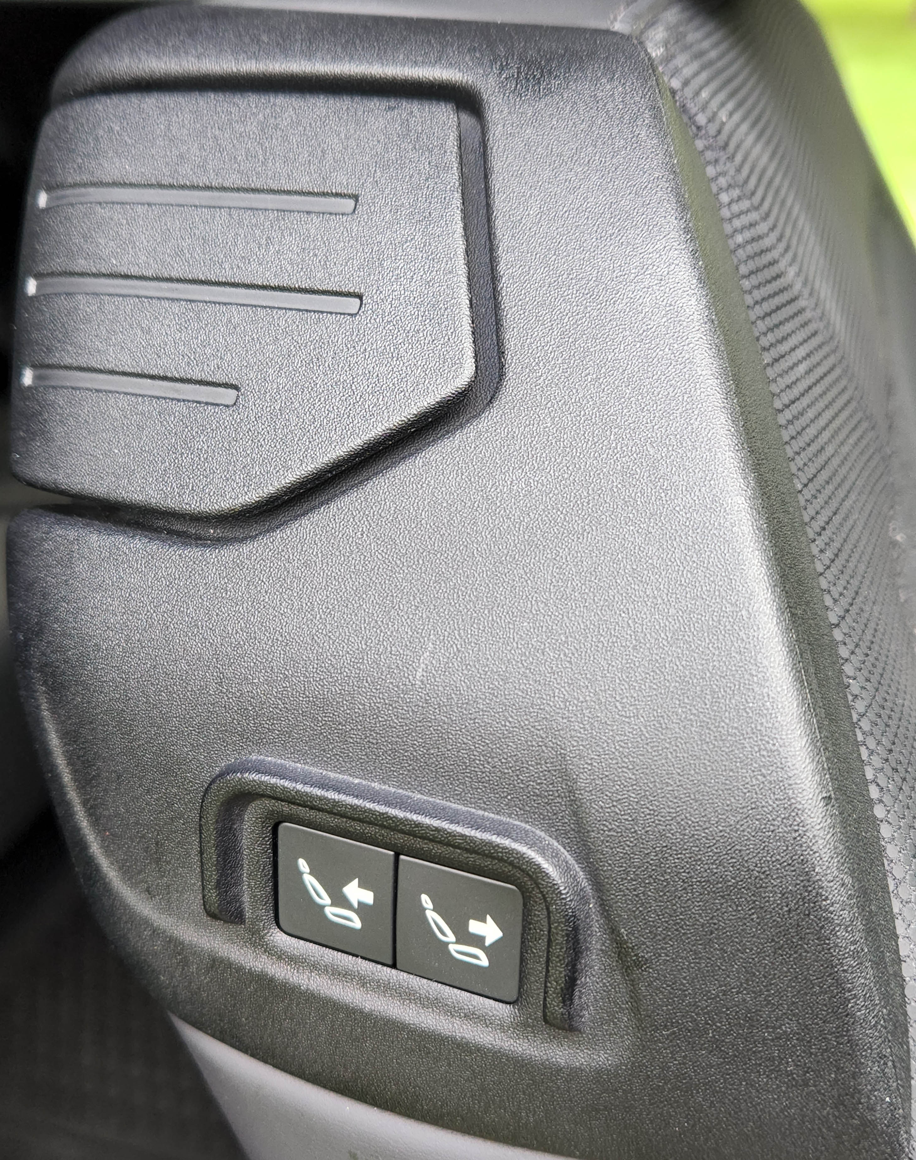 Likewise it’s awkward to climb in the Rover and especially so for rear seat riders. First problem, this is a two-door. Second problem it’s a huge step up (11.5 inches of ground clearance) to get inside, but there are plenty of grab handles on the dash and ceiling. Third, for the rear seat, which is fairly roomy, a person must press a button once to power the front seat forward, then flip a stiff lever atop the seat to flip the seatback forward. Once settled in back it’s easiest for your passenger-side front seat occupant to press, and hold, a power seat button to return the seat ever so slowly to its original setting. Again, really? I’ve been in $20k econo-coupes with one-lever manual seat access to the rear seat.