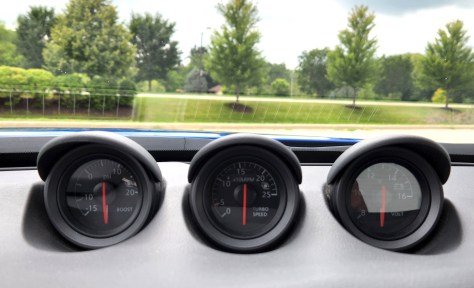 Atop the dash for a retro look are three gauges that might matter if you were racing as they tell Boost, Turbo Speed and Volts. I’d challenge most folks to know what voltage their car should be showing on a gauge (about 14 here) and as long as I can feel the turbo boost I’m not sure I need a number placed on it. So, while I appreciate the retro look, I’d say substitute more useful info such as a fuel gauge or clock.