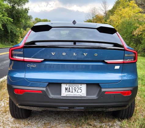 This rear window slopes severely and there are two black vents of sorts above the window to give this a performance ambiance. Giant 20-inch wheels with fancy wide five-spoke wheels gives the C40 a Hot Wheels look that is aimed at turning the heads of younger buyers, which is also a strong demographic for electrics.