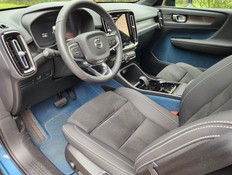 My test C40 was a pleasant Fjord Blue Metallic ($695 extra), a reflective blue-gray that gets looks and cheery comments. Inside, it was black and blue with the dash and trim being black, and the door and carpeted floor mats being a blue gray that matched the exterior.