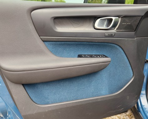 C40 is Volvo’s first standard interior not using leather, although it’s optional. Plant-based and recycled plastic bottles are used to create the seats and felt-like door trim, which looks good but feels a bit like a fake material. Trim around the 9-inch touchscreen is gloss black with chrome trim and the door release handles are a brushed chrome along with the steering wheel’s 3-spoke hub. Sadly this is not a power tilt/telescope wheel, but one supposes that saves a few electrons by keeping it manual.