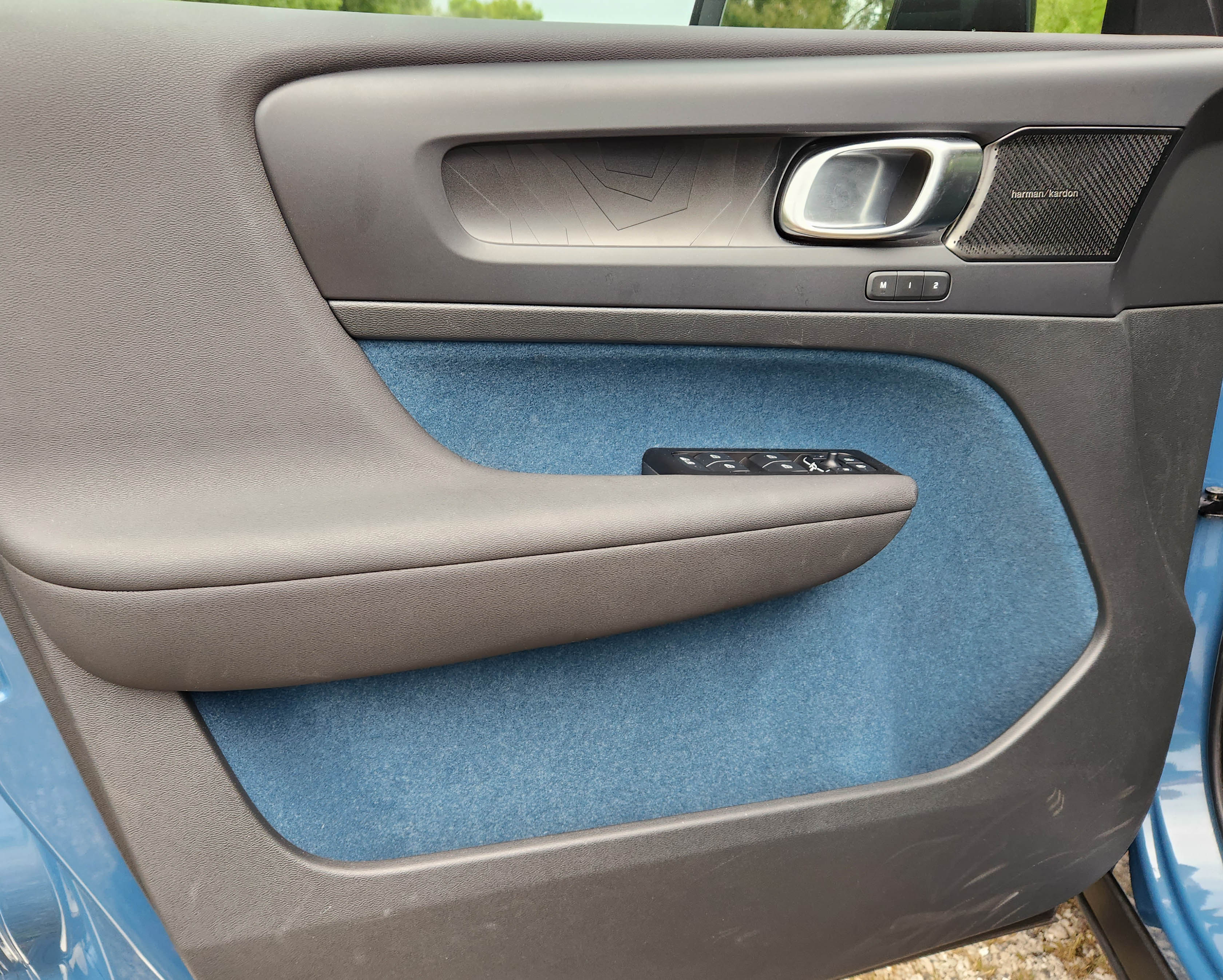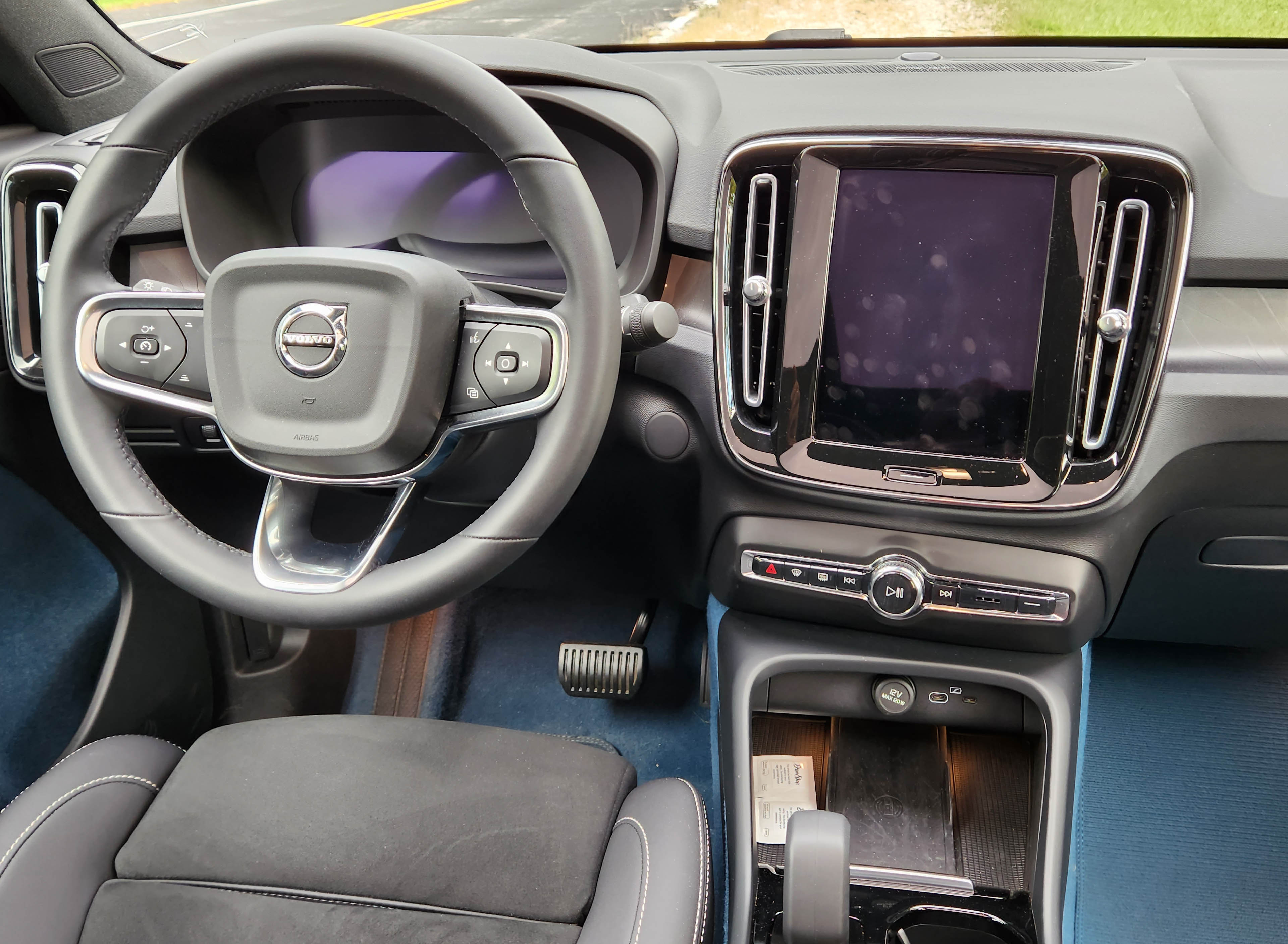 My test C40 was a pleasant Fjord Blue Metallic ($695 extra), a reflective blue-gray that gets looks and cheery comments. Inside, it was black and blue with the dash and trim being black, and the door and carpeted floor mats being a blue gray that matched the exterior.