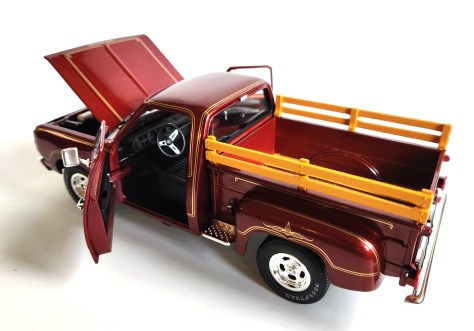 As with the previous model the bed features textured wood-look plastic panels with red metal seams in the floor and the same wood-look railing on each side of the bed to mimic that of the original truck. This is a little lighter shade (a tinge of yellow) than I’d like, but still features a wood-grained texture. In back that tailgate also can be lowered.