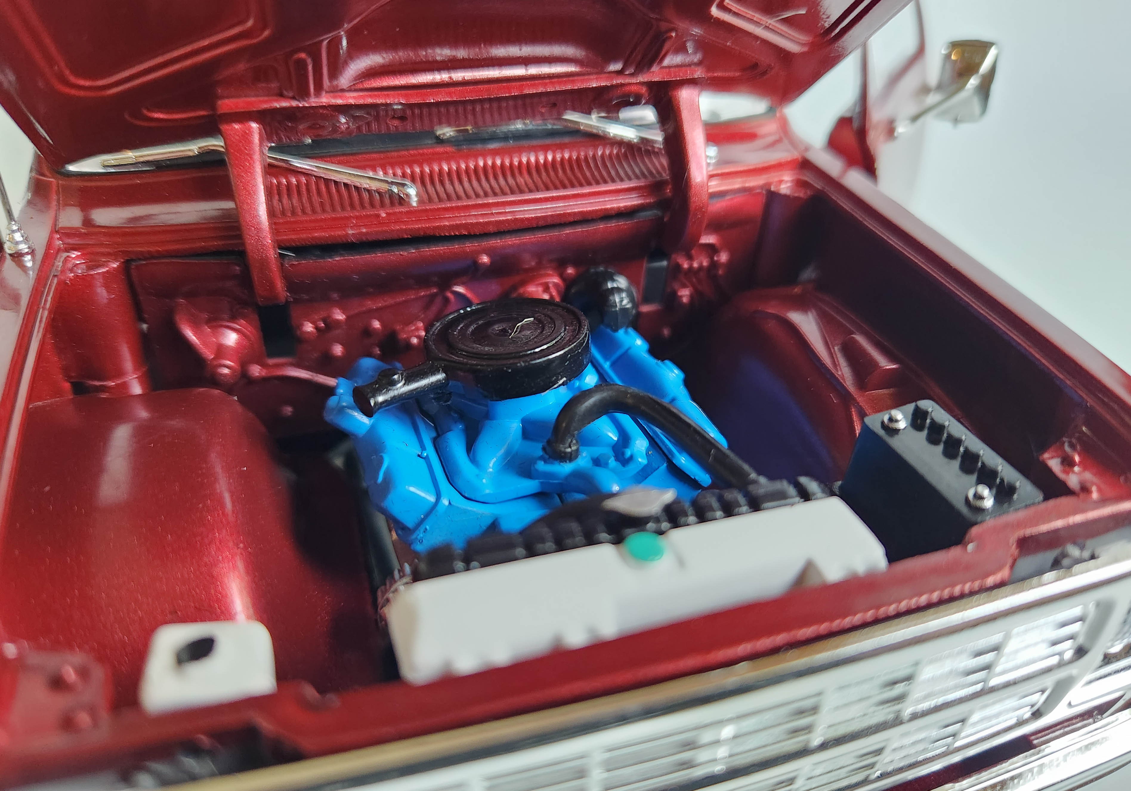 Just like the earlier 1977 model, this ’79 touts a blue block Mopar V8 under the huge hood that is supported by solid hinges so is easily posed open. There’s a black air filter cover along with big black hose running to the radiator. A white coolant container also is visible along with a white top just over the radiator and a power steering unit protrudes from the firewall.