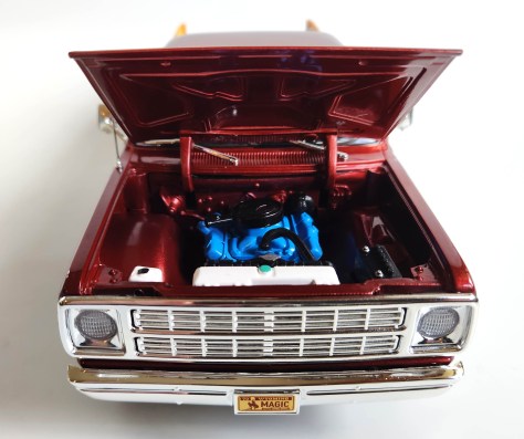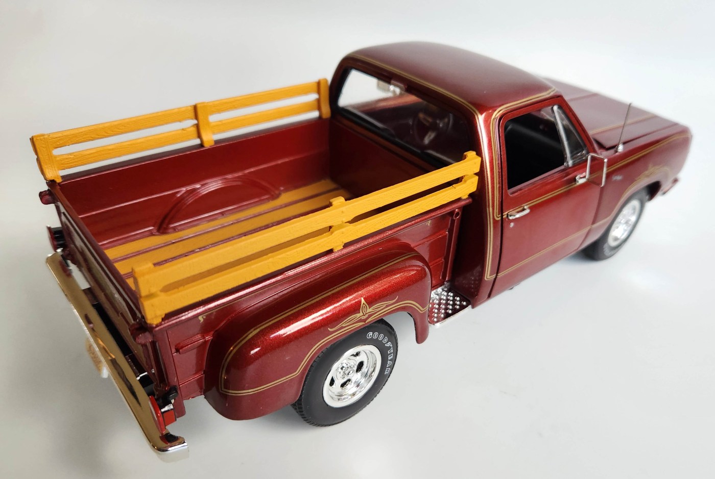 Inside, the cab is mostly black, but the door panels include more of that gold pin striping at the top to add some glam while also boxing out the lower portions of the doors to add color in what otherwise would be a dark interior. Just a bench seat as there was no Crew Cab at the time, and the dash looks great with a detailed instrument panel that includes reflective gauge faces to add realism. In addition, the steering wheel features three silver spokes while there are no seatbelts on those black seats.