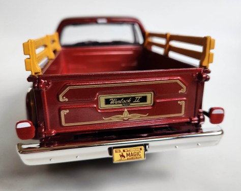 Warlock’s grille is a massive chrome number, beautifully recreated, plus chrome front and rear bumpers, large side mirrors, wipers, door handles and side steps on this Stepside model. The racy custom Mag wheels also are chromed and there’s a silver gas cap by the step on the driver’s side. A short chrome antenna protrudes from the top of the passenger’s side front fender.