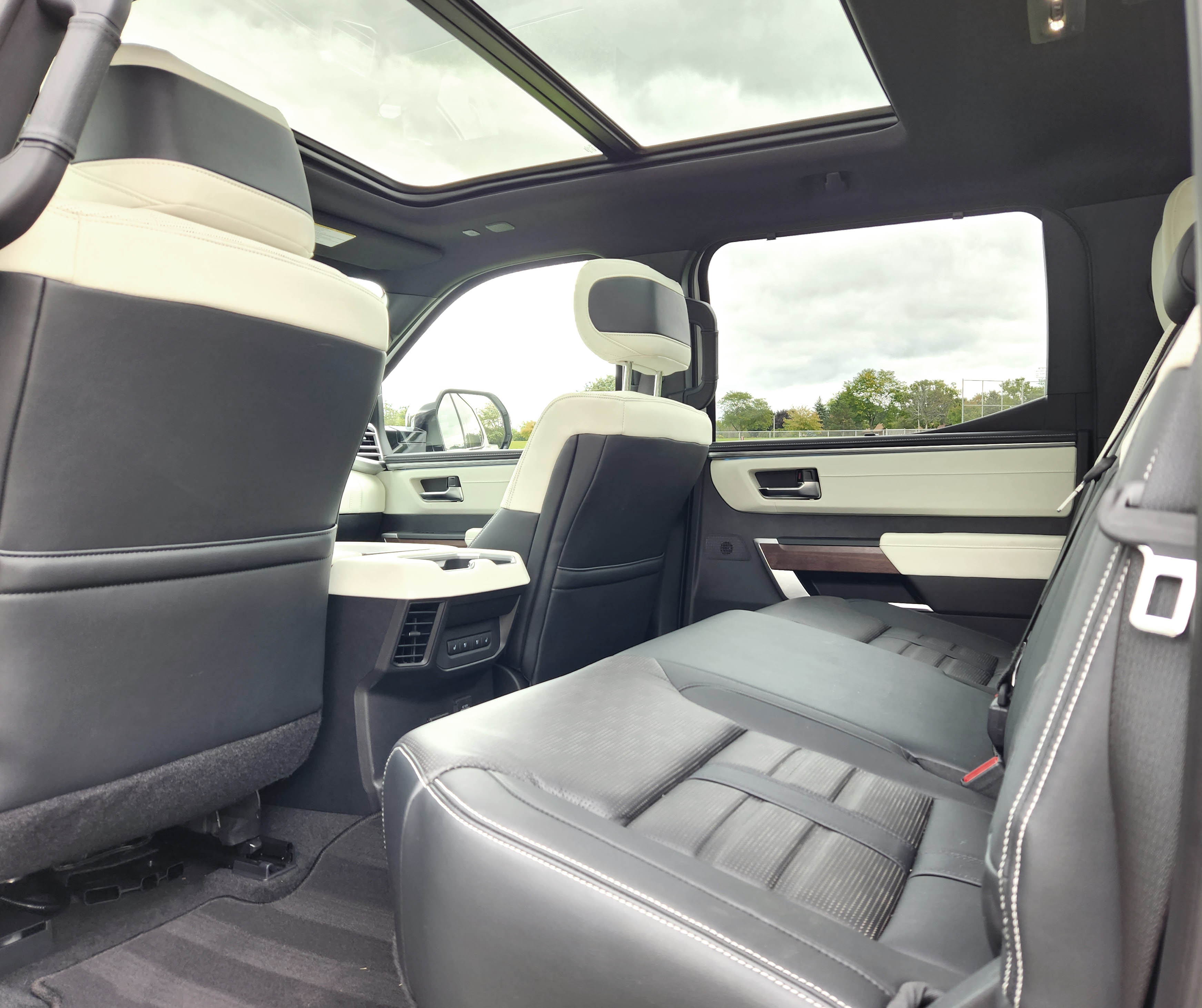 Overhead is a panoramic sunroof and sun shade. The rear side windows feature their own manual sunshades and there’s an SOS button overhead along with a button to power down the truck’s center rear window panel, nice if hauling something long that needs to extend into the cab.
