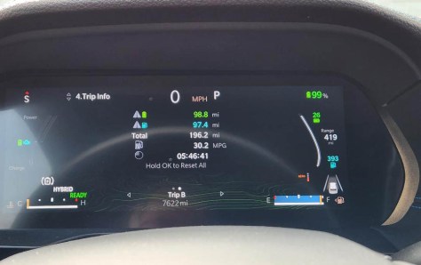 In a 230-mile week of driving I evenly split my electric vs. gas powered driving, recharging with the driver’s side front quarter panel plug-in, each evening.