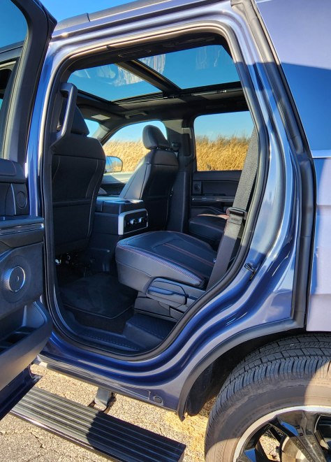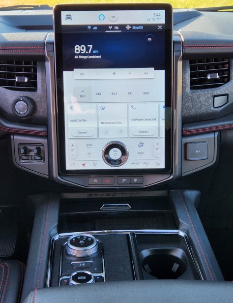 Expedition is a three-row vehicle and roomy for up to eight passengers if you go with the standard second row bench seat. This one had captain’s chairs in row two (both heated), so would only accommodate seven. Cargo room is modest behind that third row, but large once it’s lowered and huge with both rear rows down. Remember there’s a Max version with another foot of cargo room in back.