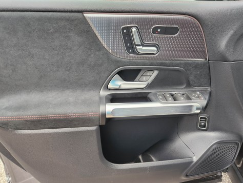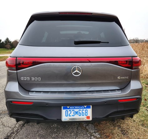 I can attest that the EQB300 is a hoot that’ll scoot. Power delivered via the single-speed transmission is silky smooth and instantaneous. There was even a bit of chirp to the 18-inch tires, and secure traction once we got a little slop on the roads thanks to that AWD. But I can’t emphasize enough the fun of tromping the accelerator and being pushed back into the well-shaped black suede and leather seats, neatly trimmed in red stitching.