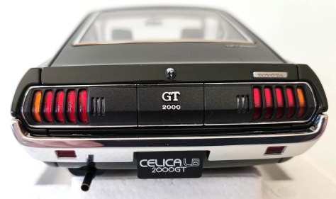 There are black vents (three stacks per side) atop the hood, tasteful but racy, while the black grille appears to be photo-etched with a snazzy GT logo. Headlights are clear, but displaying proper depth for a realistic look, and a front license plate proclaims Celica LB 2000GT, as does one on the tail.