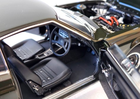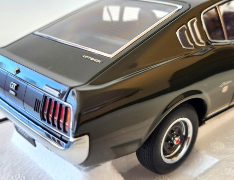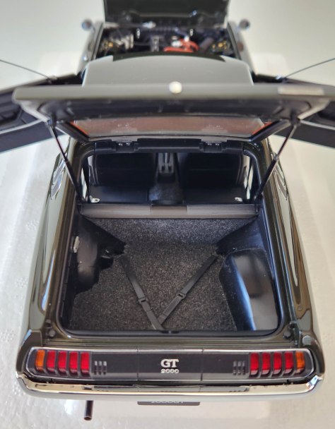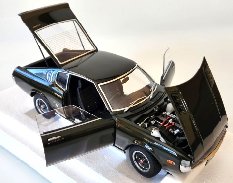Autoart’s detailing is superb with chrome trim around all the windows, those C-pillar louvers, the door handles, an antenna stub, racy mirrors mounted far forward on the front fenders as was common in Japan, and naturally the front and rear bumpers. Even the leading edge of the hood includes a slim delicate chrome trim and there’s more along the rocker panel, just below the GT 2000 racing stripe on each side.