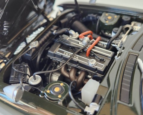 Celica’s hood opens from the rear and reveals an absolutely stunning engine bay, one of the best I can recall on a 1:18 scale model not costing $300+. This looks like an engine compartment at the dealer’s showroom, clean and tidy with the I4’s header proudly labeled Toyota in silver and a detailed oil filler cap there too. All the wiring and plumbing is in place and there’s a battery, shock tower caps, all fluid bottles including a clear plastic windshield cleaner container on the firewall. Also visible are the radiator, air cleaner, which lays off to the driver’s side by at the car’s nose, plus throttle body hookups, etc. Wow!