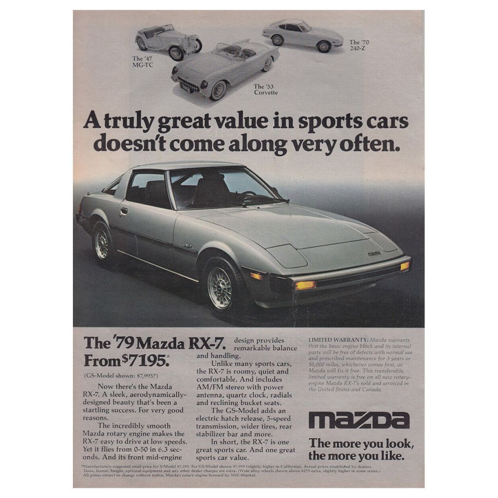 These are certainly affordable vehicles to own and drive now. Hagerty values for the 1979 Mazda RX-7 GS ranges from $5,500 in Fair condition all the way up to $45,800 in Concours and they are trending up. I found a bunch of them on Bring a Trailer (BaT) for less than $10 grand.