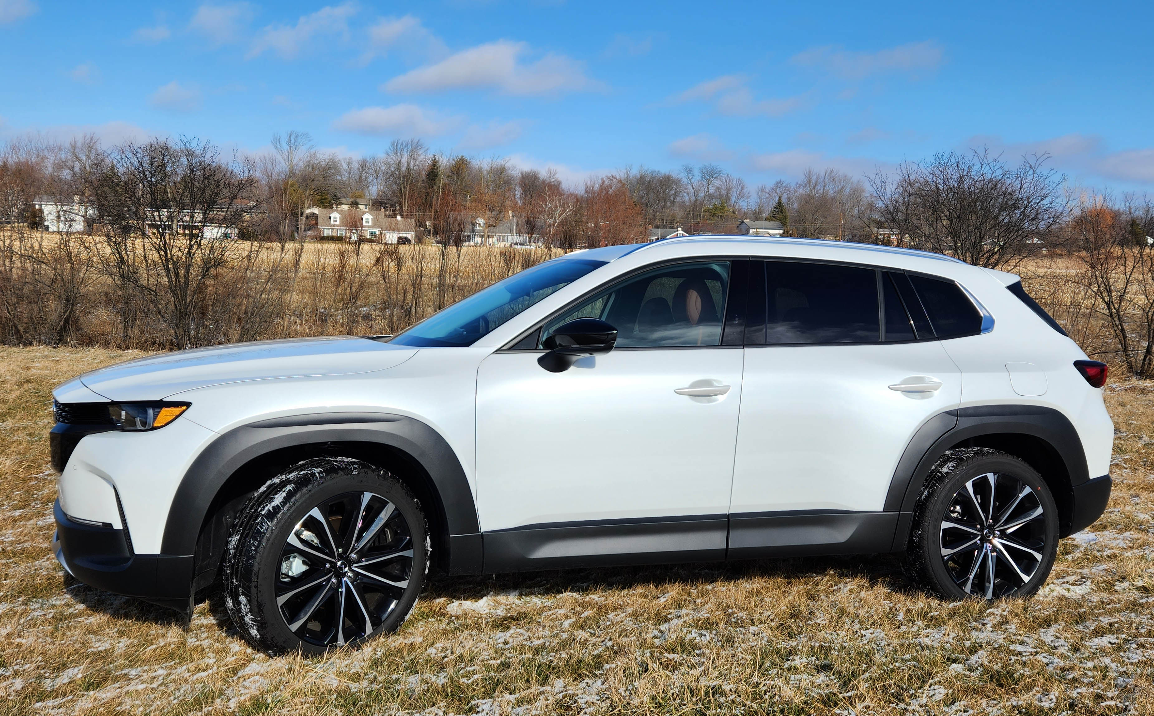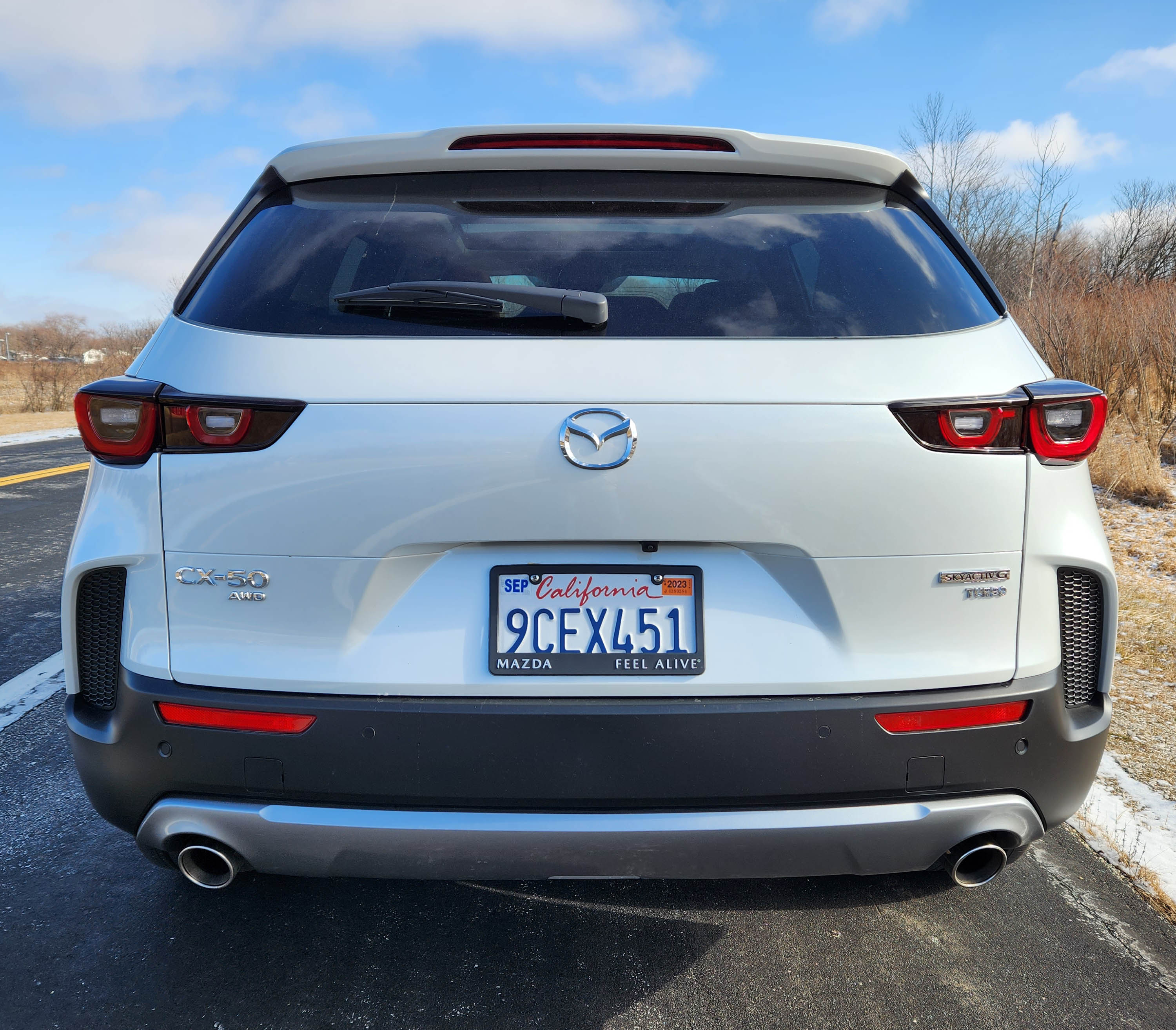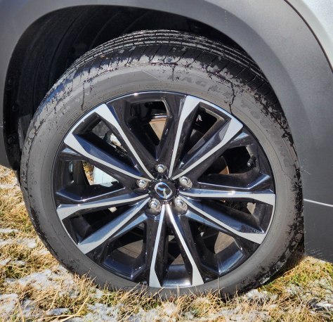 Don’t go all mental on me now. Driving the CX-50 is a blast on dry or simply wet pavement. This being the 2.5 Turbo Premium Plus model it was loaded with goodies, most importantly the 2.5-liter SkyActiv-G four-cylinder with a turbo that kicks in quickly and delivers punchy performance. Horsepower is 227 normally, but can jump to 256 if you opt for 93-octane premium fuel.