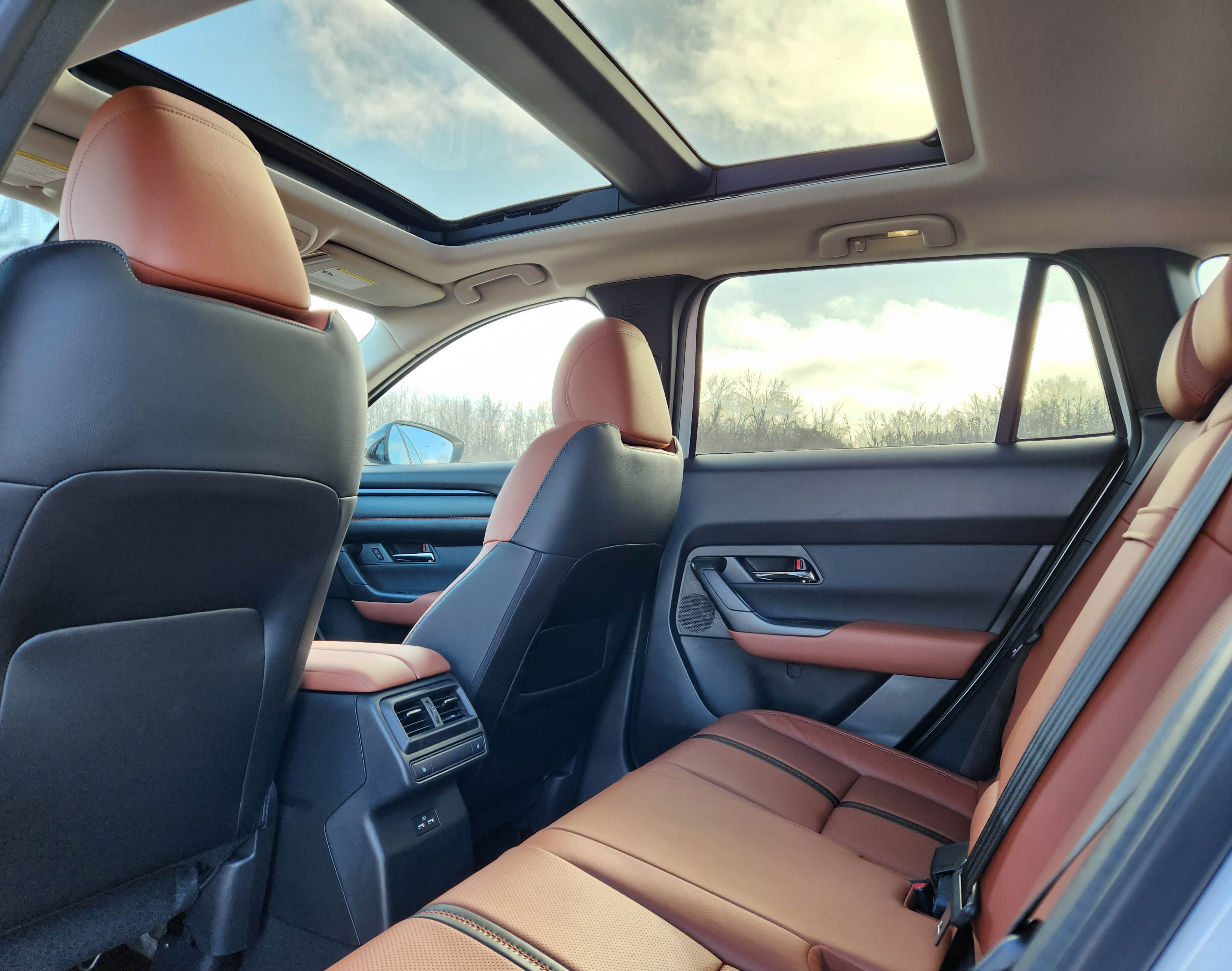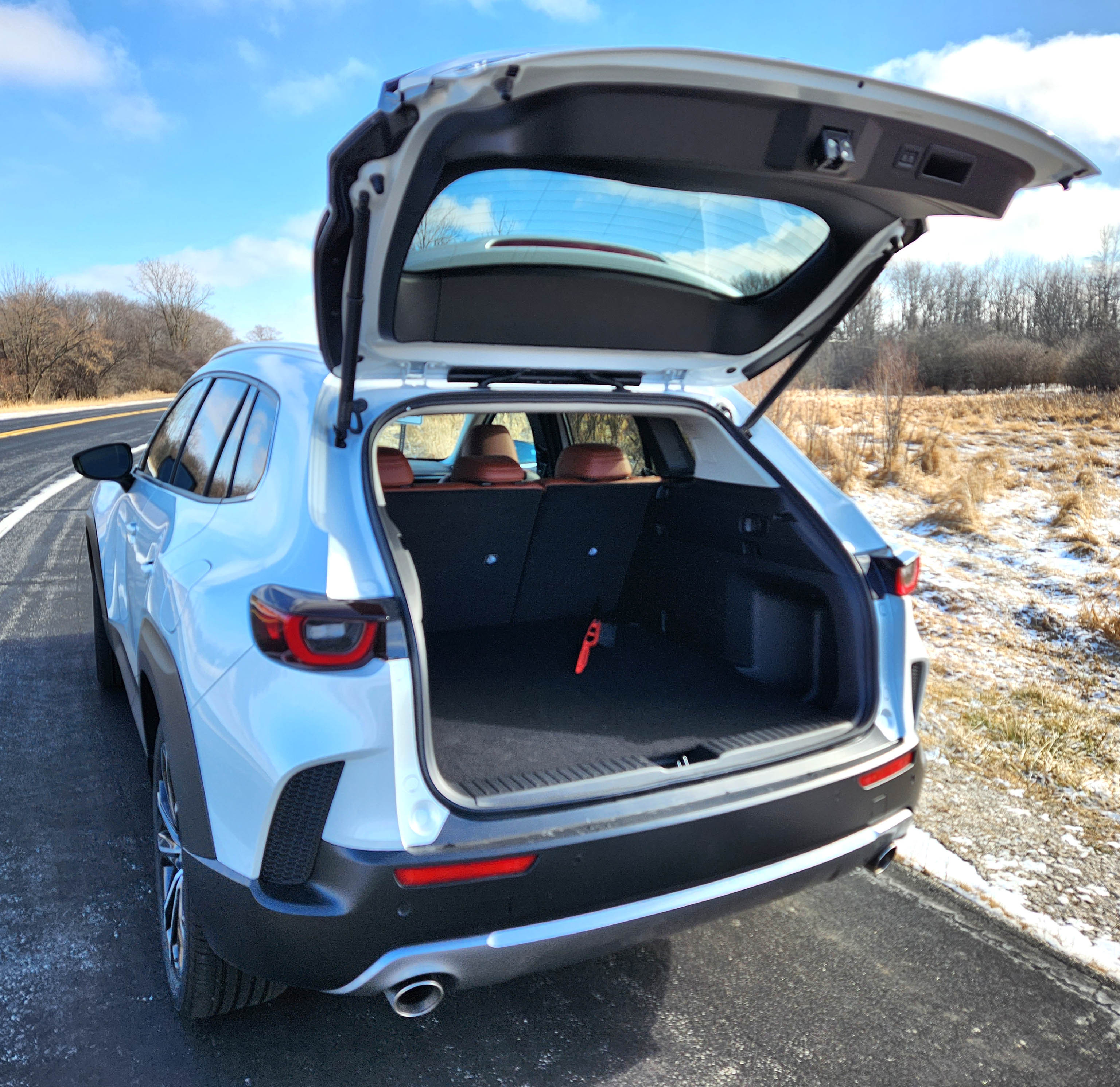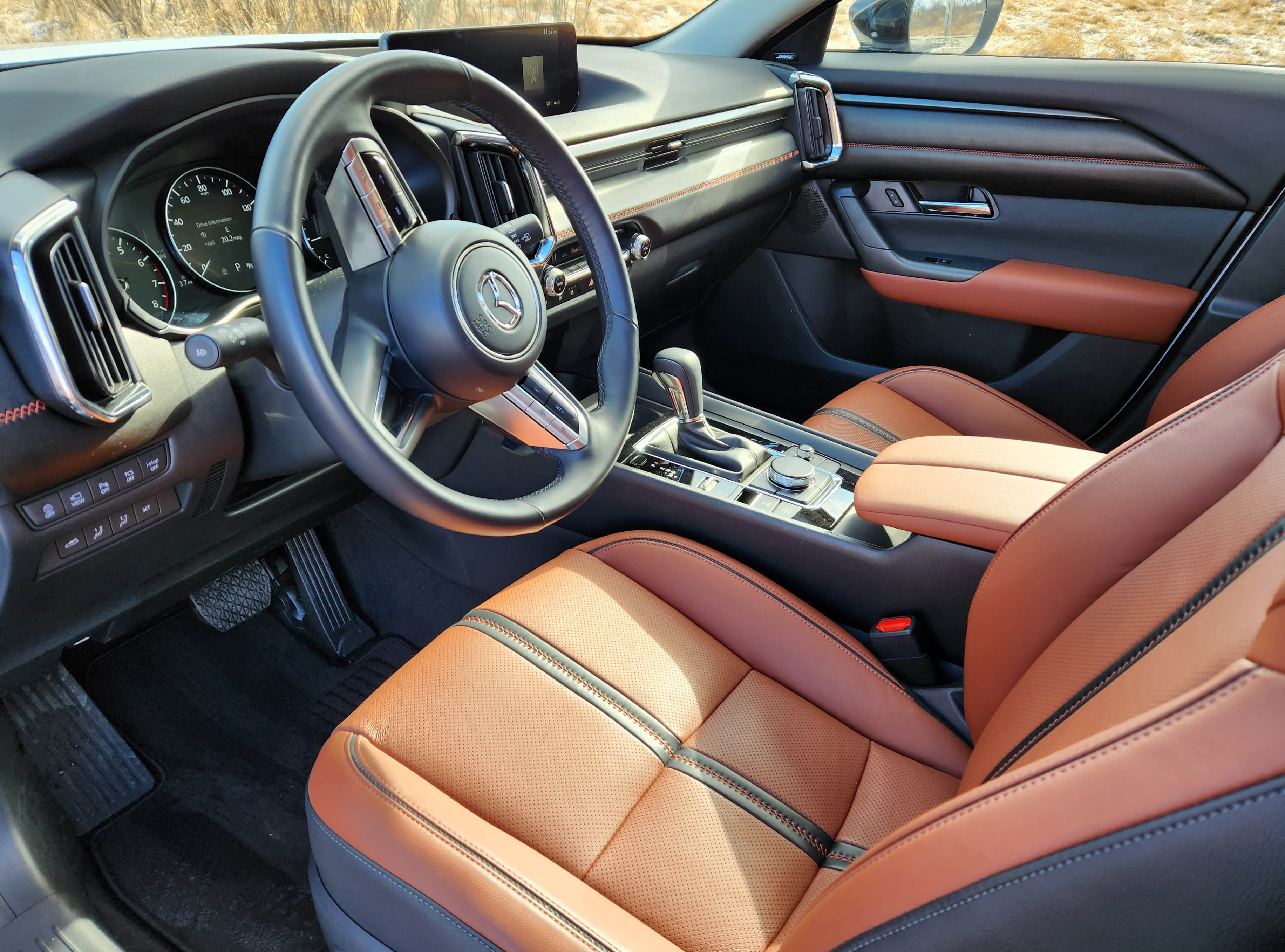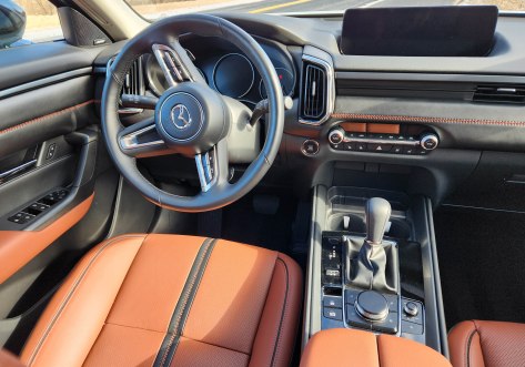 Even if Mazda didn’t nail the exterior styling, as it always seems to with an aggressive beak-line nose, its interiors are top shelf, often feeling like they belong in at least entry-level luxury vehicles. It spoils riders in this pearl white (Wind Chill) tester with reddish-brown leather-trimmed seats and black accents. These are extremely well shaped and supportive, although a tad hard. That color is also used for accent stitching in the black door panels and across the black dash. Quite spiffy.