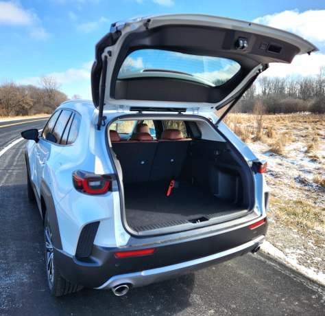 This interior has more legroom in the second row seats than the CX-5, a plus, but slightly less headroom. Long-legged, but short torsoed riders rejoice! Storage space remains fairly generous behind that split seat, which will lower to boost cargo room. Yes, there’s even a spare tire under the cargo floor. I know some vehicles have abandoned that practice, a tough lesson if you don’t know until you need it. The rear hatch also is powered and includes a wiper.