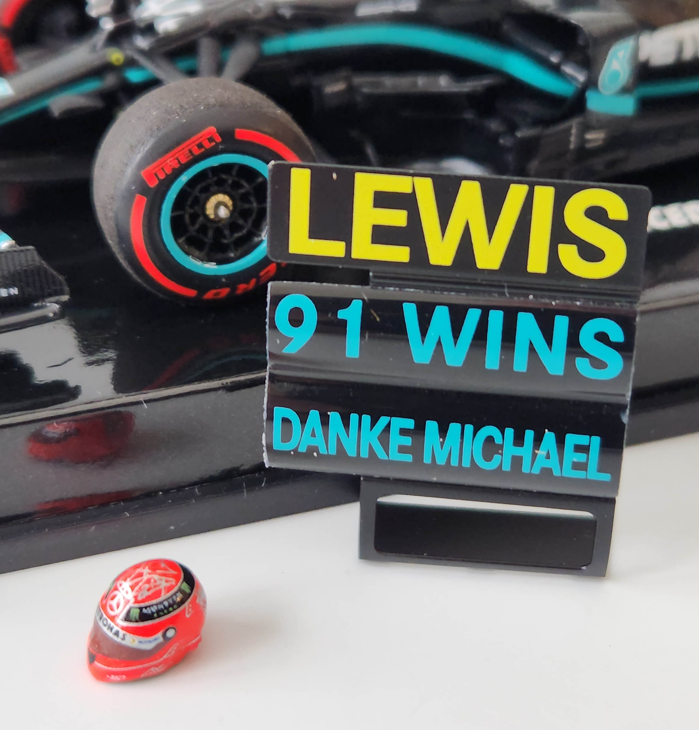 This special release marking his record 91st win also includes a replica of an orange Schumacher helmet that was presented to Hamilton after his victory, and a pit board that can be posed with the car. Atop it says Lewis in yellow with 91 wins and Danke Michael in turquoise below that. Classy!
