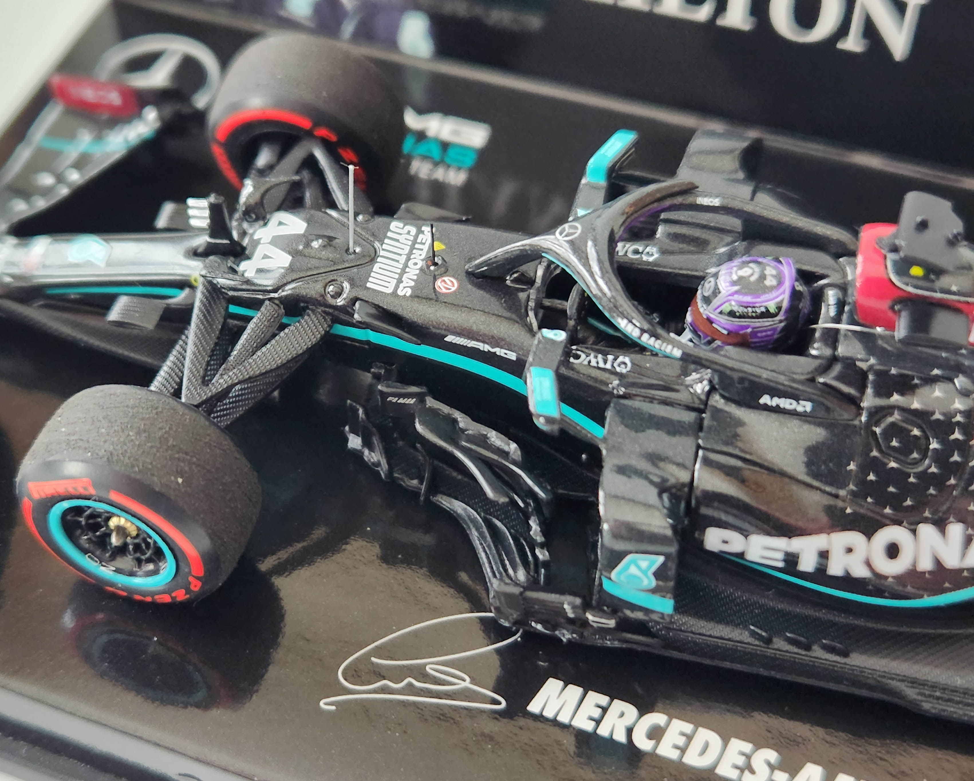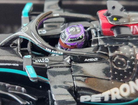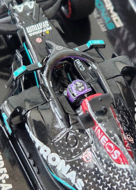 Minichamps includes the dark red trim around the air intake just above Hamilton’s head, including the Ineos logo. That logo is also on the wing’s rear.