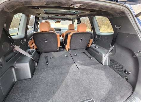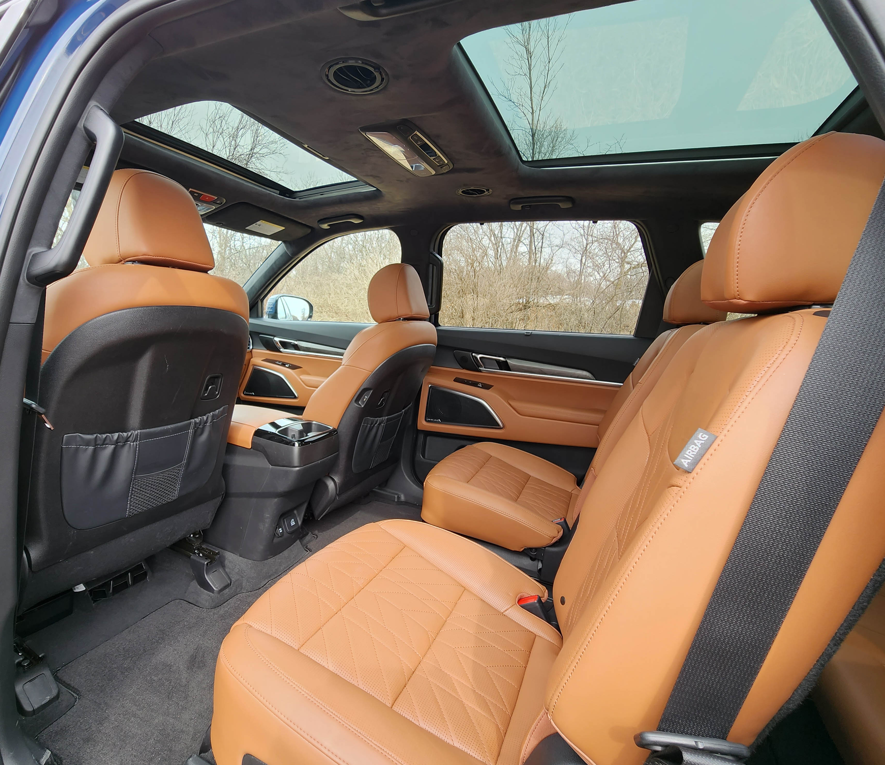 All those screens are easy to see and read and the test truck’s Terracotta colored Nappa leather interior is gorgeous, costing just $295 extra. Seats are powered, heated and cooled, wide, and well-shaped while row two’s captain’s chairs are heated and cooled too. They also slide back and forth to allow reasonable legroom for rear passengers in row three. The Kia’s steering wheel also is heated.