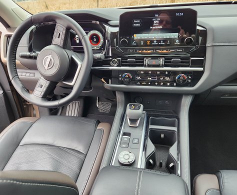 The Platinum Pathfinder also touts quilted semi-aniline leather seats for long-haul comfort. These were a soft gunmetal gray with chocolate trim that looked as luxurious as they felt. Seats are relatively flat too, which is particularly nice for a long drive. Everyone praised Pathfinderās comfort level, and its quiet interior, except when the giant twin dual-pane sunroofs were uncovered, not opened. Retract the sunshade and a fair amount of additional wind noise enters the cabin.