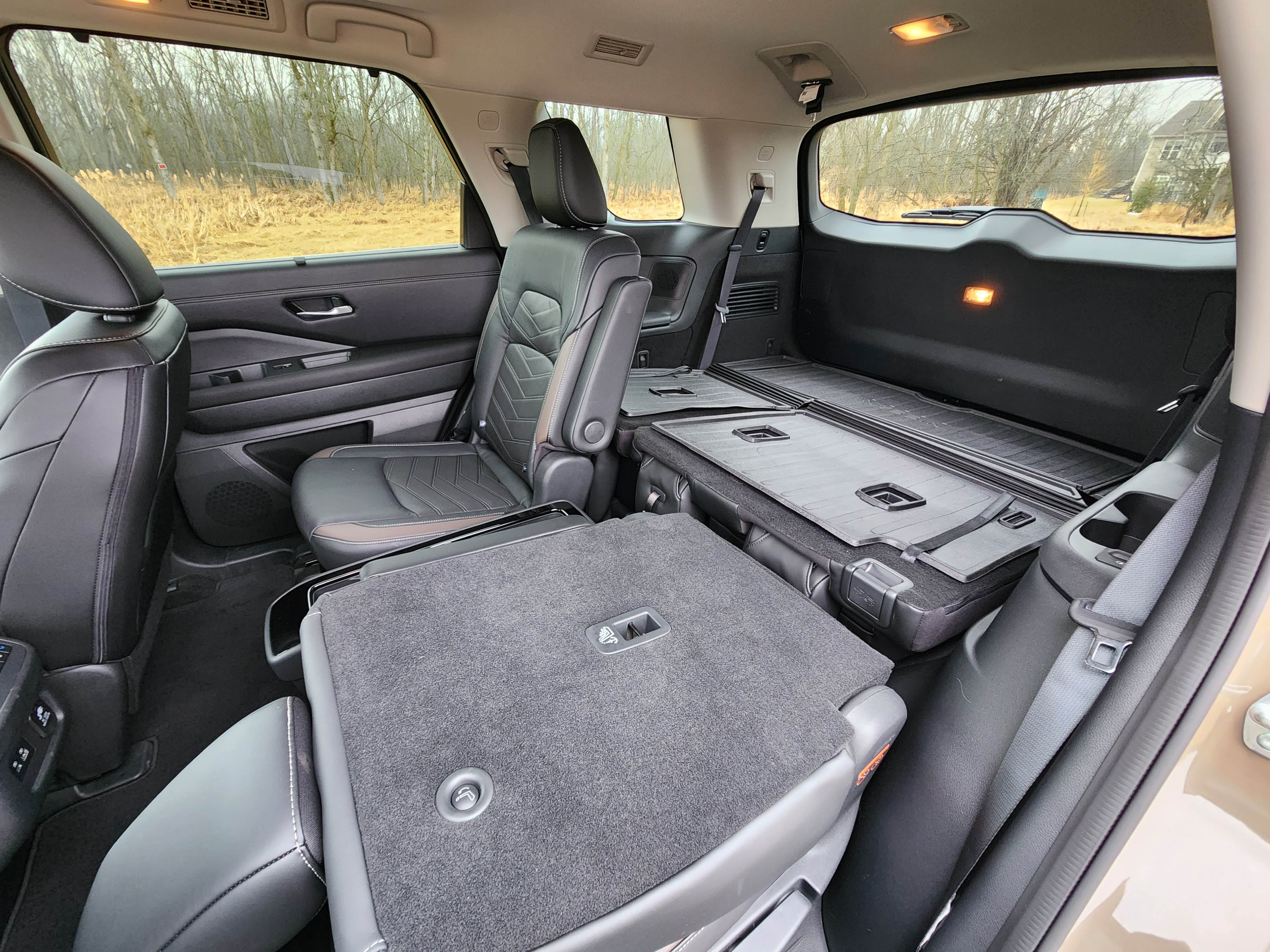 If you need to haul folks in row three the Nissan touts EZ Flex seats, which means you press a button on the lower side or upper back of either row two seat and they fold and slide forward for easy row three access. A bar below the seat cushions allows a row two rider to scooch forward some to grant their siblings in back decent foot and knee room, better than many three-row SUVs, although Toyotaās upcoming Grand Highlander promises room for row three adults.