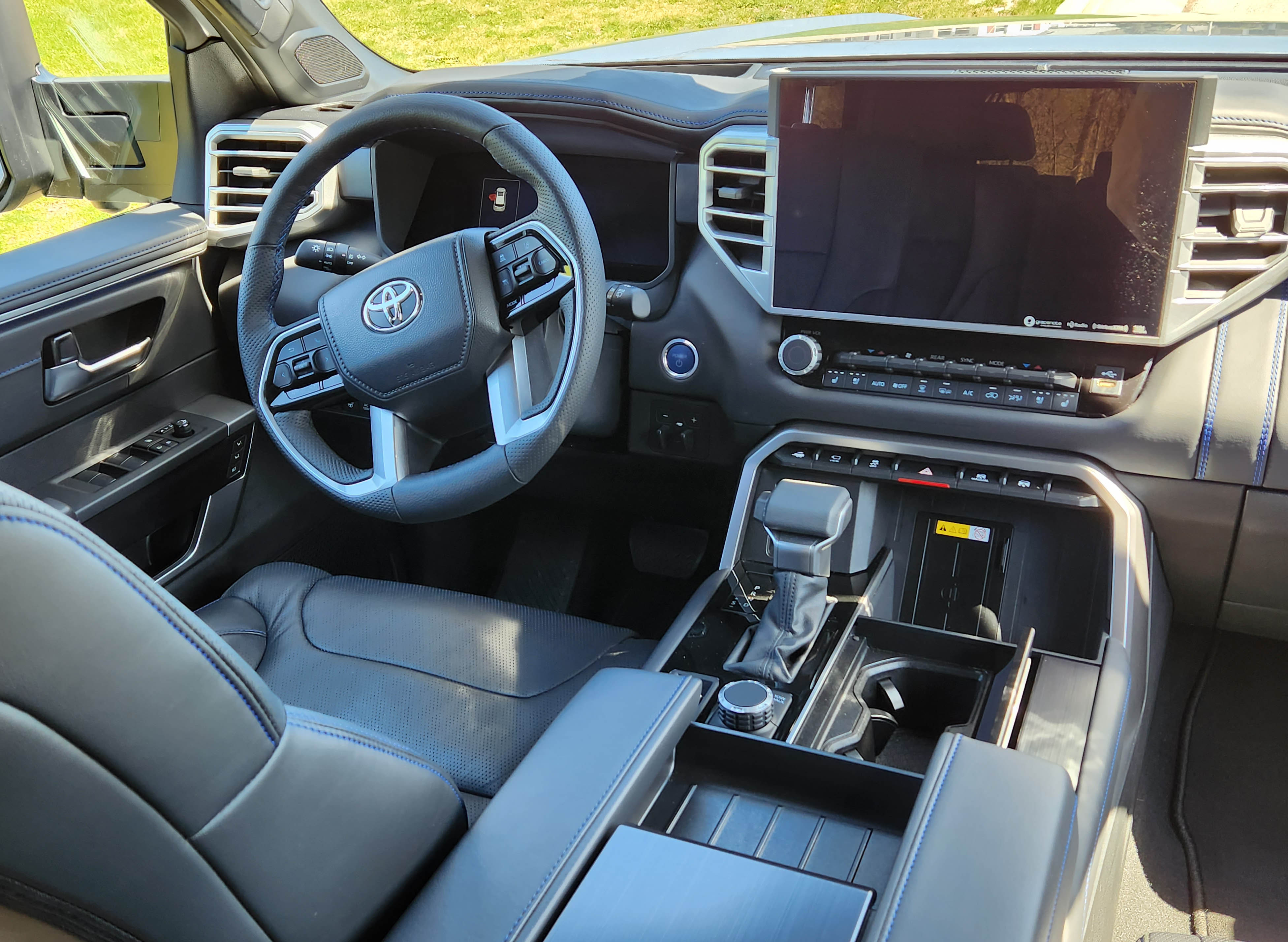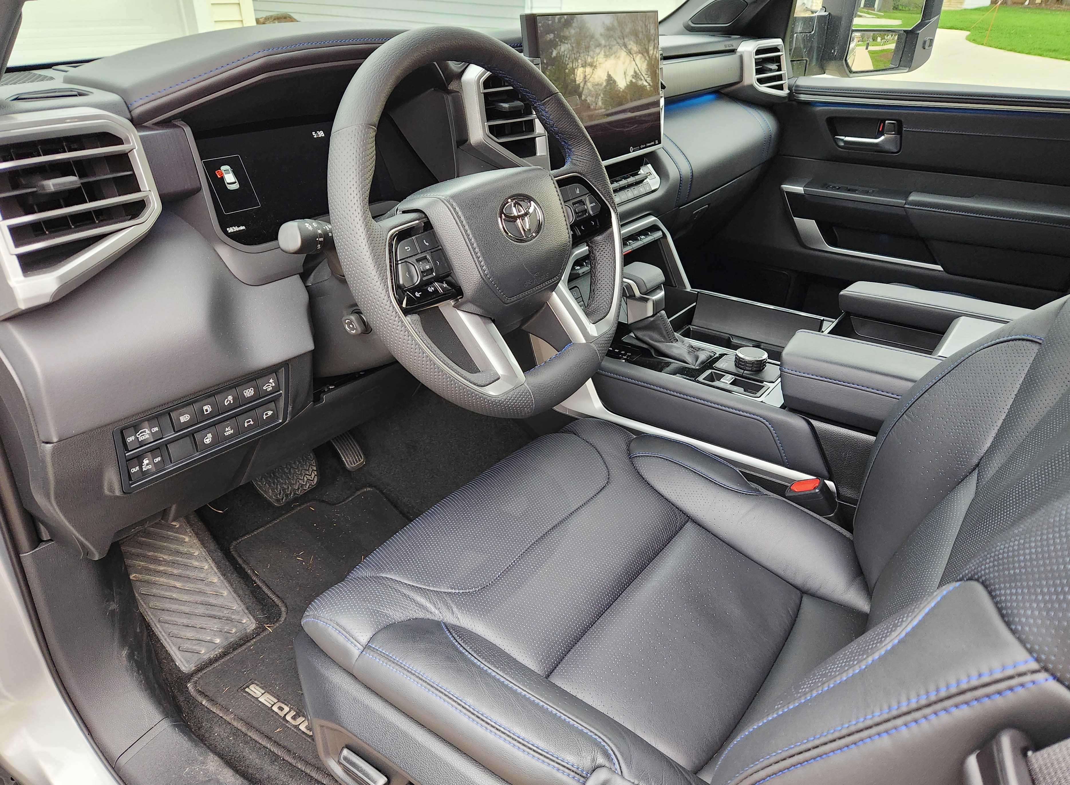 Sequoia’s interior has been modernized, meaning the tiny info screen has been replaced by a 14-inch mega-screen. That seems a bit much, but the good news, it’s an easy to use touchscreen, so no awkward touchpad on the console. Plus Toyota delivers a large volume knob and the big screen shows the 360-camera images in fine detail.