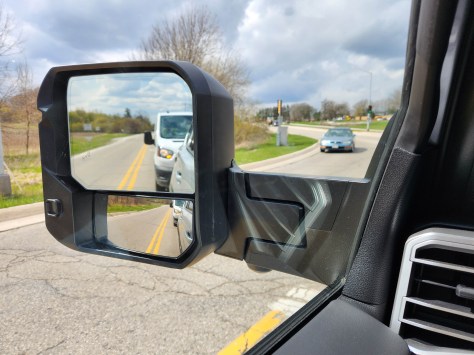 As a short driver I could barely see to the side at an intersection as the mirrors are so tall. I found myself boosting up with my legs to see over the mirrors. Dangerous for me, but a 6-foot something driver may be fine, especially if they have a long torso. For parking purposes the mirrors will power fold flat against the truck’s side.