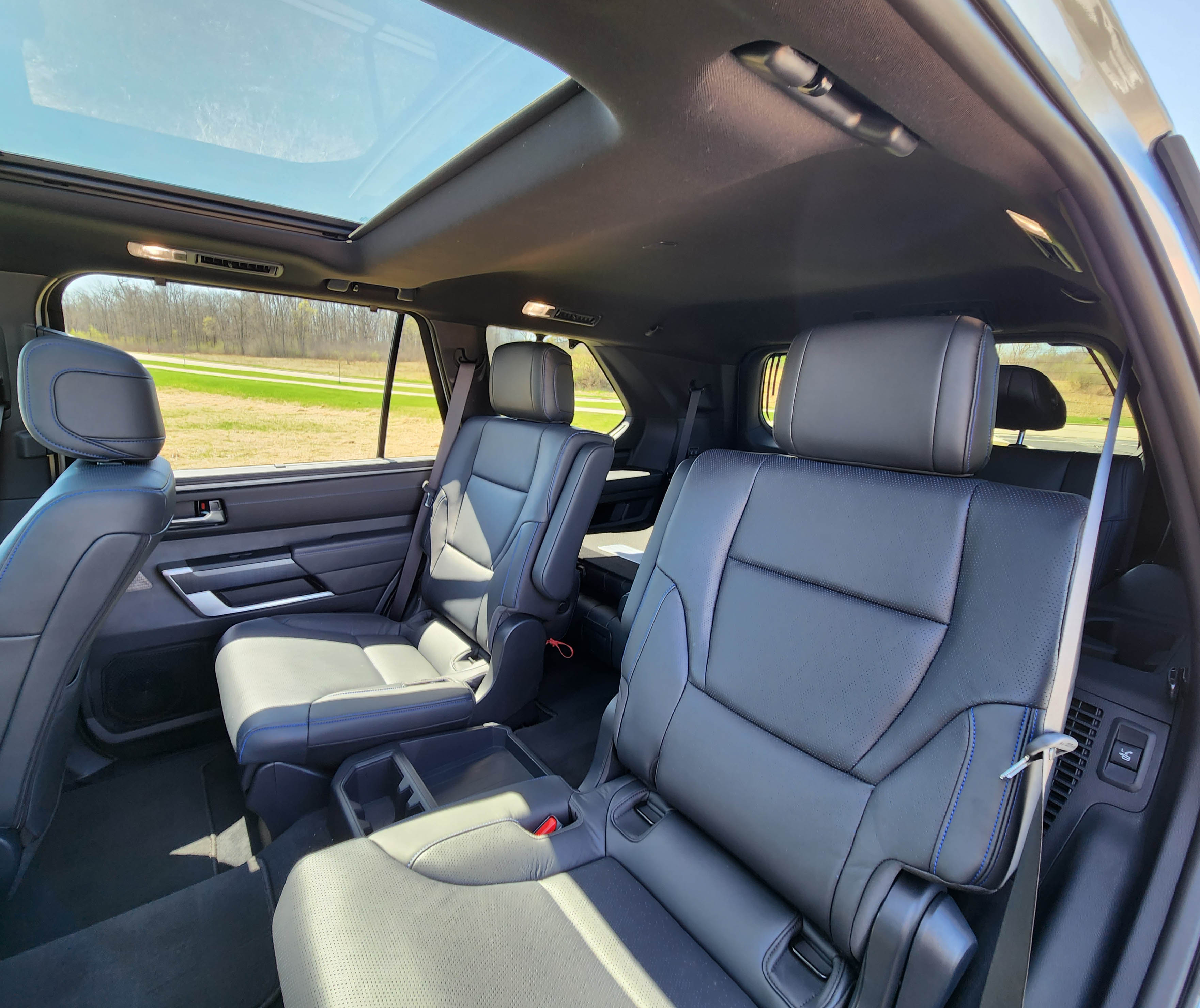 Notably the Sequoia features three rows of seats, the third row powering down via buttons under the power hatch or on panels just inside the rear doors and next to the second row seats so one can reach them without crawling in back. Those second row seats also spring forward with the pull of a handle to allow easy access to row three.
