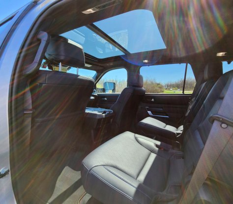 Overhead are giant sunroofs, one occasionally generated mild wind noise. Inside, the black leather seats are fairly flat and along with the doors and dash include blue trim piping. The test truck also added a 10-inch color HUD for $600.
