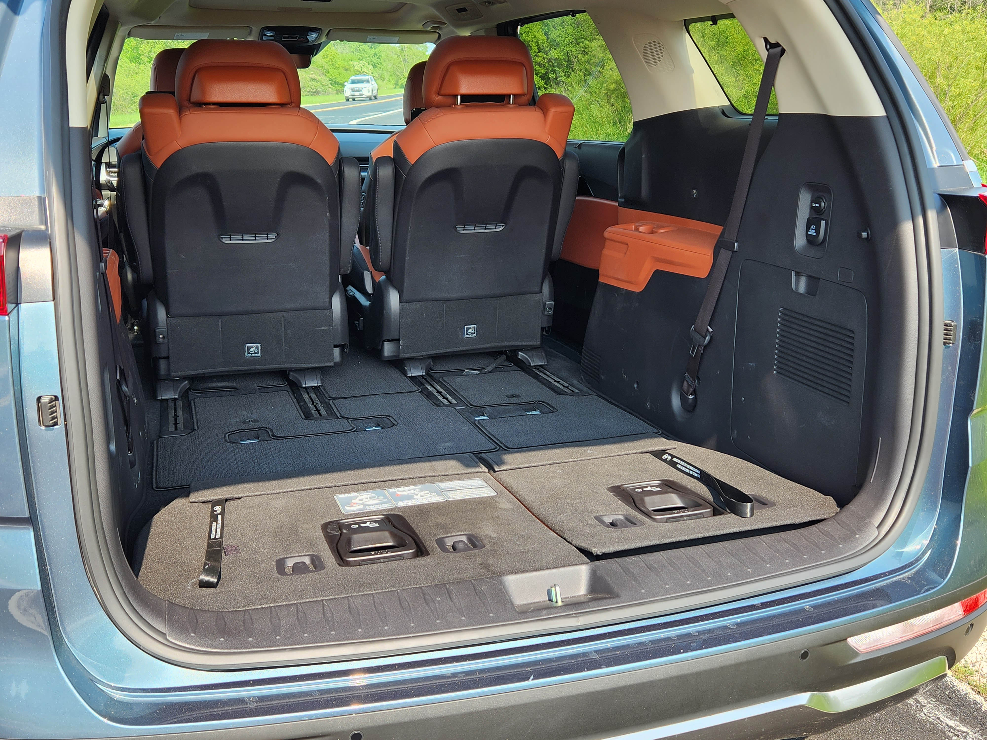 Hits: Sharp looks, excellent power, good handling and ride, loaded with safety equipment. Massive rear seat legroom, row-two seats slide side to side, recline and have foot rests, third row stows in cargo floor, 2 sun roofs, all rear windows have sunshades, heated/cooled seats front and second row, heated steering wheel, good digital dash and info screen, 4 drive modes, second row 2 screens, wireless phone charger, snazzy black wheels.