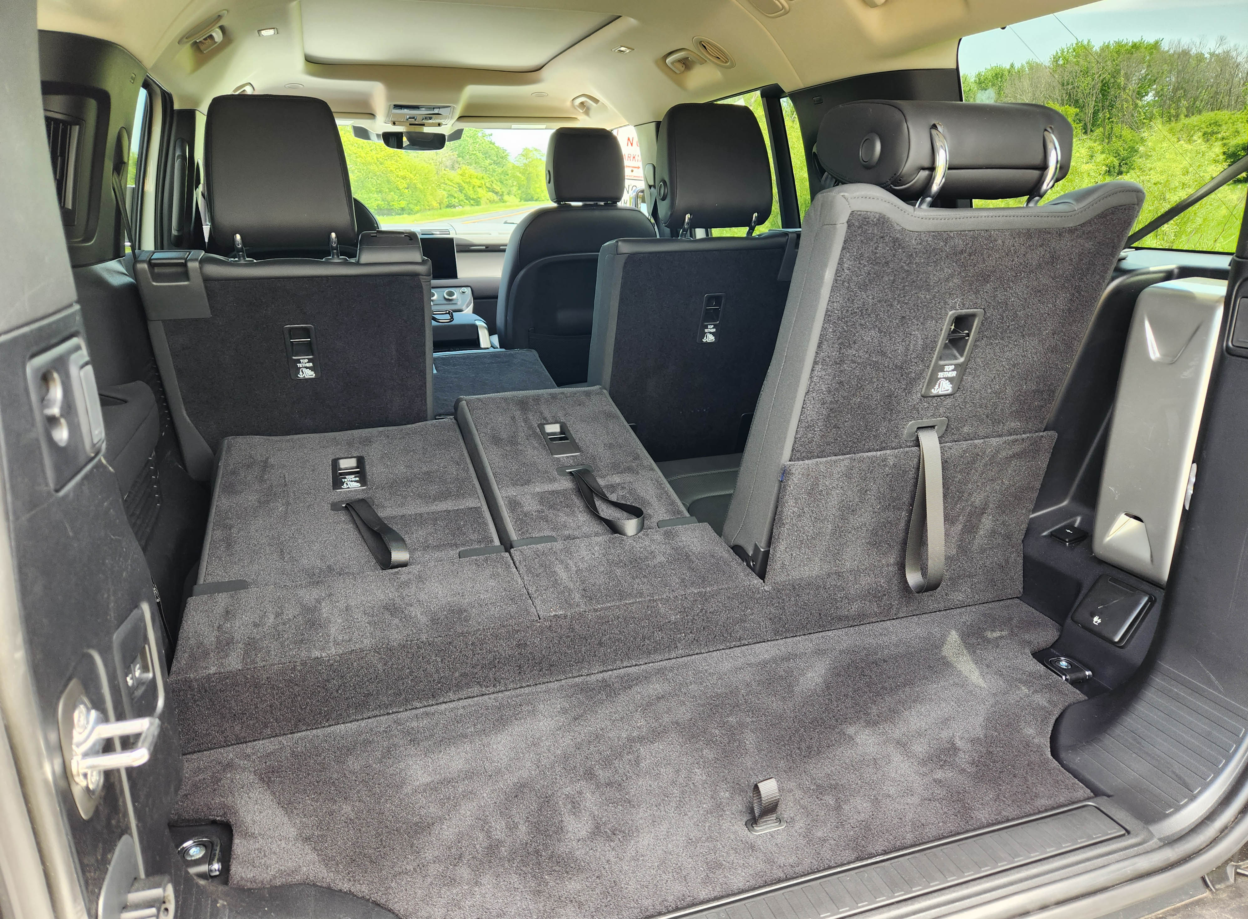 Overhead is a power panoramic sunroof for the front two rows and a smaller manual sunroof over the third row. No side window sunshades though. And what’s up with that big white metal panel on the exterior, just in front of the third row seats. It covers a roof pillar inside, but it’s a styling eyesore and also partially blocks visibility from that back row.