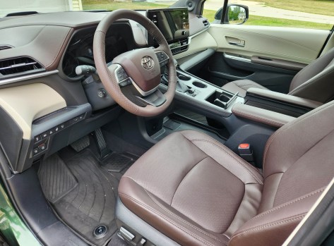 Inside, well, Sienna looks and feels high-end with brown leather seats, steering wheel and lower dash and door trim, including padded armrests and console armrests. Mid-level dash and doors are a cream color creating a ritzy two-tone look.