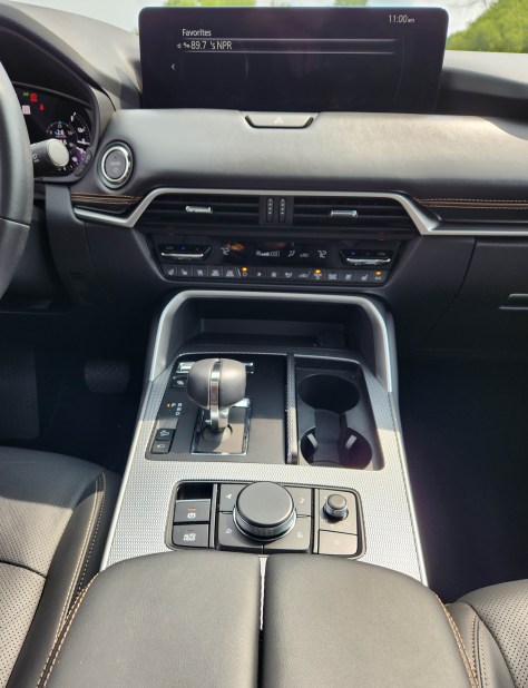 The CX-90 also features a small shift knob with an unusual shift pattern. Instead of a Park button or straight up location for Park, this one requires a push forward to Reverse, then a left slide over to Park. Annoying!