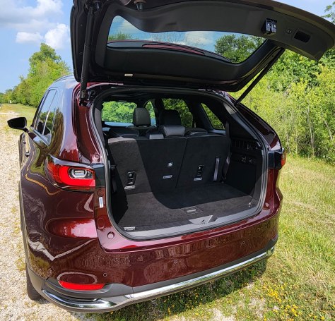 The third row splits and folds flat manually and the headrests fold down automatically to make that easy. Cargo room behind the third row is good too and the charger cable will store beneath the cargo floor. The CX-90’s rear hatch is powered and can be actuated via a foot wave under the rear bumper, but be careful. I was unloading something from the rear when it thought I wanted that hatch closed and started beeping and lowering. A quick push against the hatch stopped my being squished.