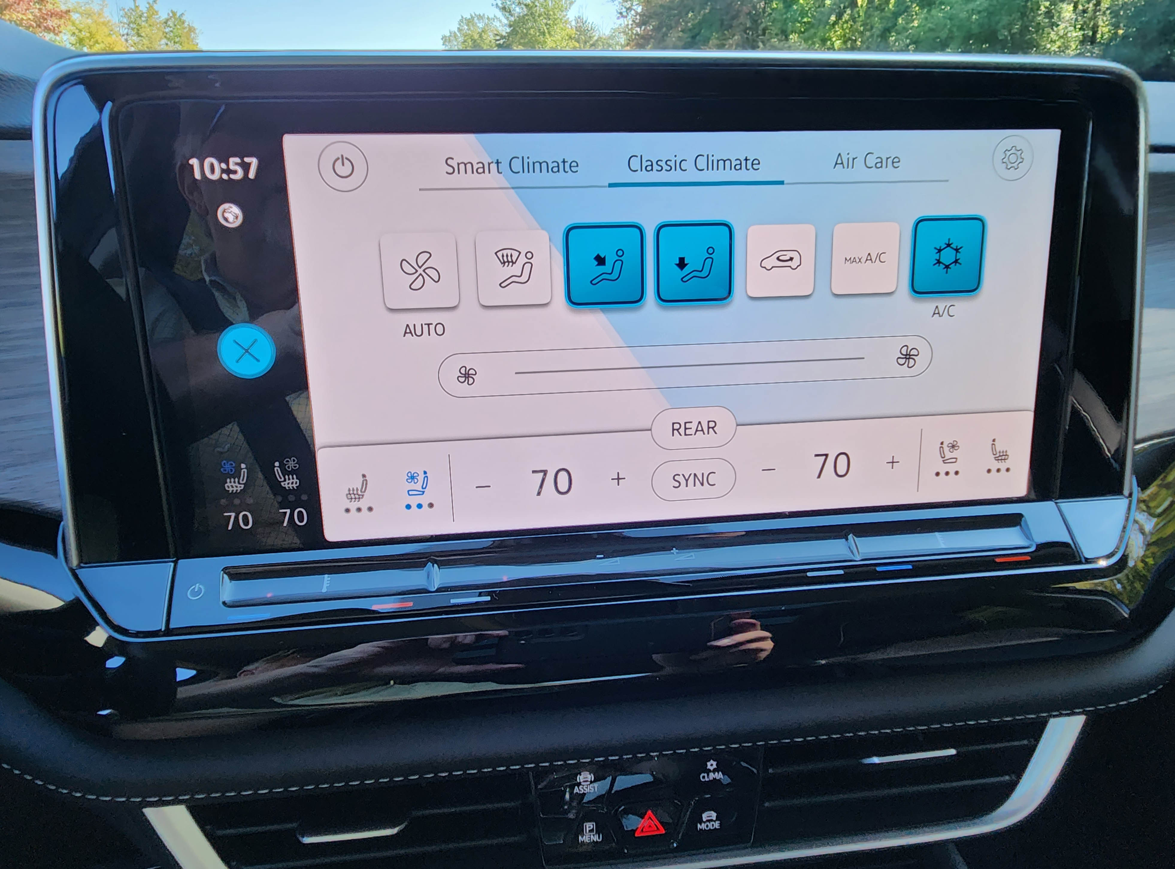 Like so many other makes VW puts the climate controls on the screen, and once you find the Climate button below it that’s not so tough to adjust, except the fan speed, which is nearly impossible. Also the heated and cooled seat adjustments are on screen, so not as convenient as console buttons. VW designers apparently live where it’s warm.