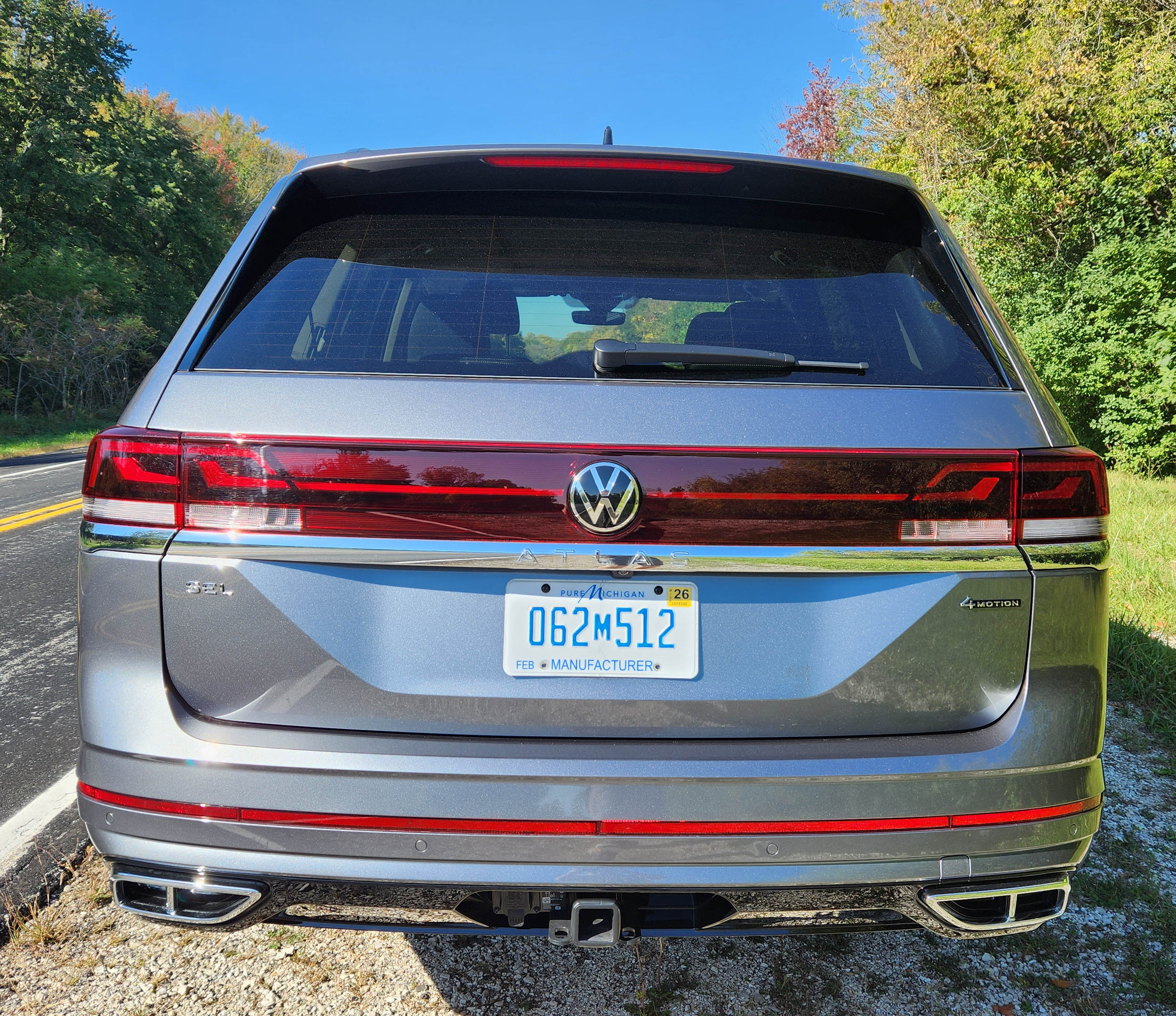 Another plus, the handsome exterior styling. Nothing fancy mind you, but well blended lines from the grille and hood to the remainder of the vehicle, plus a sophisticated looking R-Line logo and trim that blends in with the accent lines that come off the well-formed wheel well bulges. Dressed up in the no-extra-charge Platinum Gray Metallic (medium silver/gray) the Atlas would fit right in at any country club.