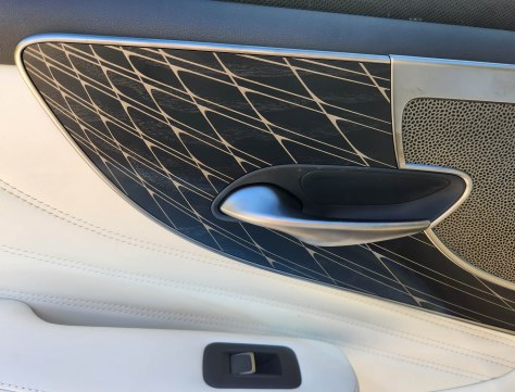 Lexus designs a useful and luxurious interior with white quilted leather seats and door trim, plus accents that give the LS some elegant pizazz, if that makes sense. For instance the door inserts feature black wood with metal inserts that create an elegant design, while spreading across the dash are thin metal strips that fan out sort of like thin sword blades. Sharp!