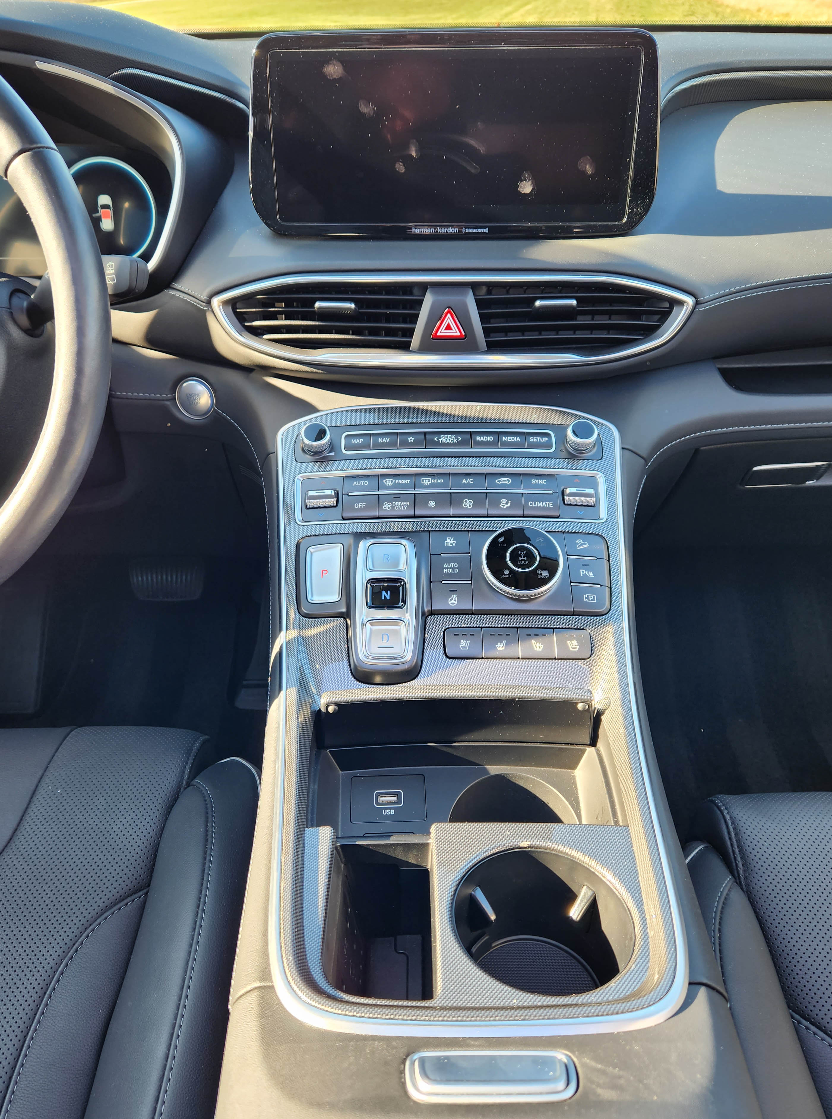 Power here is a strong 261 horsepower compared with just 191 horses from the 2.5-liter I4 in the gas-only Santa Fe. It’s smooth and linear thanks to the SUV’s silky 6-speed automatic. Jumping on the freeway simply turn the drive mode dial on the console to Sport and boom you’re hitting 70 mph. Then dial back to Eco and cruise.