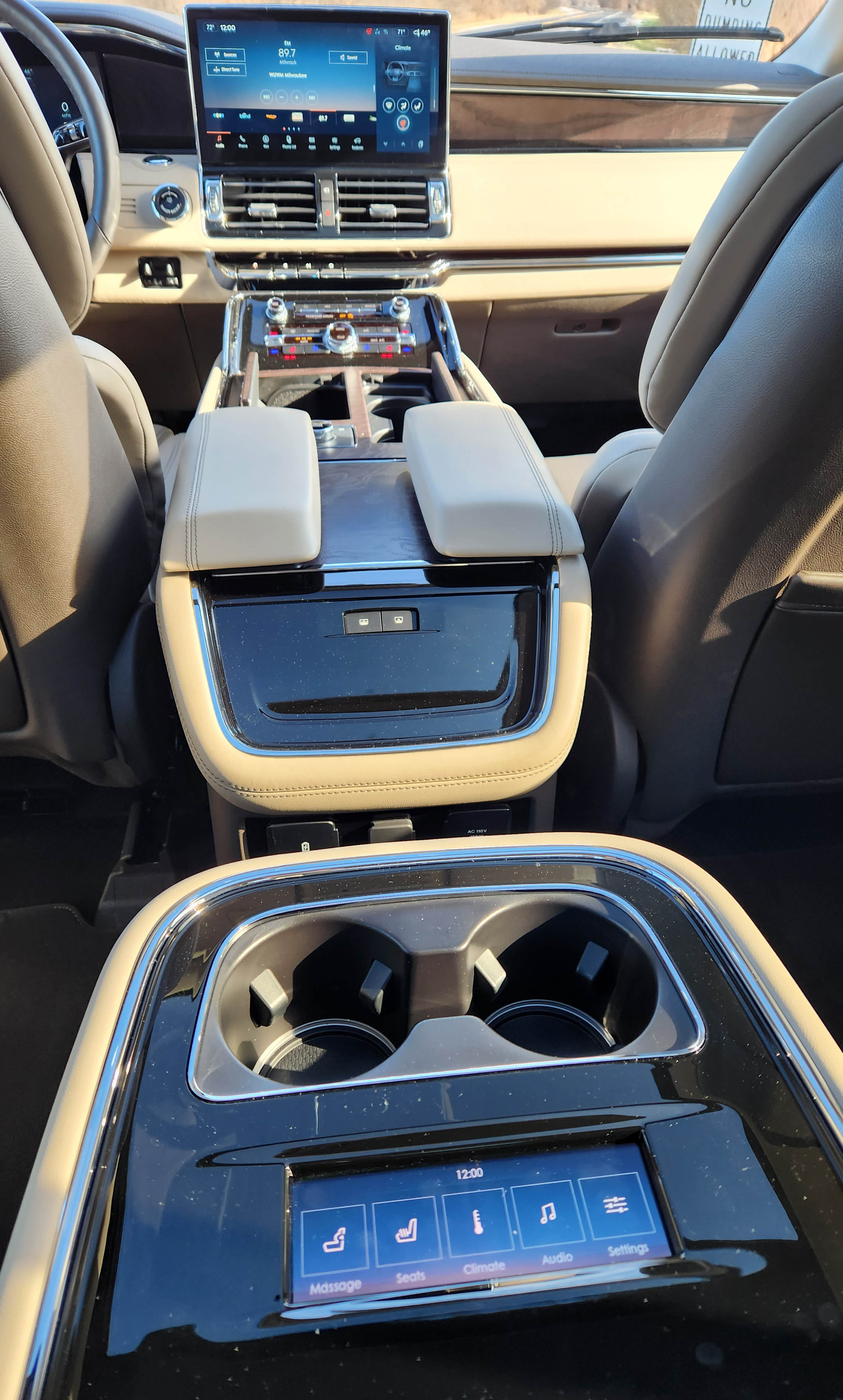 But here’s where things start to get interesting. While front and second row seats are heated and cooled, there’s also a massaging feature for both rows. Yes, a driver or his or her favorite three passengers, can each punch a button to turn on massaging seats. The rear seat had a giant armrest/console with screen to adjust these, along with climate controls and radio.